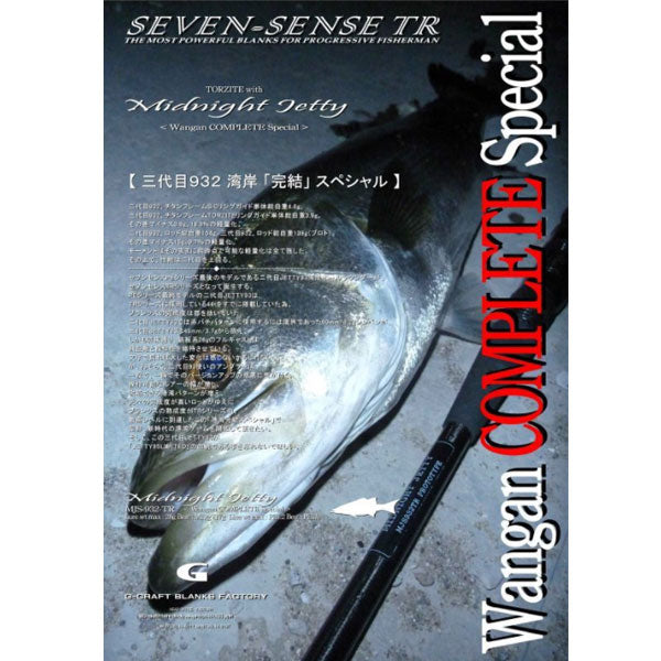 二代目932チタンフレームSiCリングガイド単体総自重4.8g。 三代目932チタンフレームTORZITEリングガイド単体総自重3.9g。 その差マイナス0.9g。 18.8%の軽量化。 二代目932ロッド総自重154g。 三代目932ロッド総自重139g(プロト)。 その差マイナス15.3g。 9.7%の軽量化。 モーメントはそのままに現時点で可能な軽量化は全て施した。 その上で、性能は初代を上回る。セブンセンスPEシリーズ最後のモデルである二代目JETTY93湾岸オールラウンダーが、セブンセンスTRシリーズとなって誕生する。 PEシリーズ最終モデルの二代目JETTY93はTRシリーズに採用している46tをすでに搭載していた為、ブランクスの完成度は郡を抜いていた。 二代目JETTY93では赤バチパターンに使用するには限界であった60mm/6.2gシンペンが、三代目JETTY93は45mm/3.7gから扱え、しかも従来通り、鉄板系26gのフルキャストは飛距離と操作性を維持させている。 文字で見れば大した変化は感じないかもしれない。 が、おそらく、二代目93使いのアングラーは一投で、一瞬でそのバージョンアップの恩恵に気が付く。 操作可能なルアーの幅が増し、攻略できる港湾パターンが増え、元々の完成度が高いロッドがゆえにブランクスの熟成度がTRシリーズ中、最高レベルに到達したこの「港湾完結スペシャル」で是非、新時代の港湾ゲームを開拓して頂きたい。 そして、この三代目JETTY93が「JETTY95LIMITED」の血統である事を忘れないでほしい。