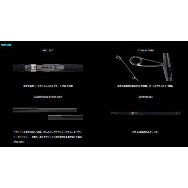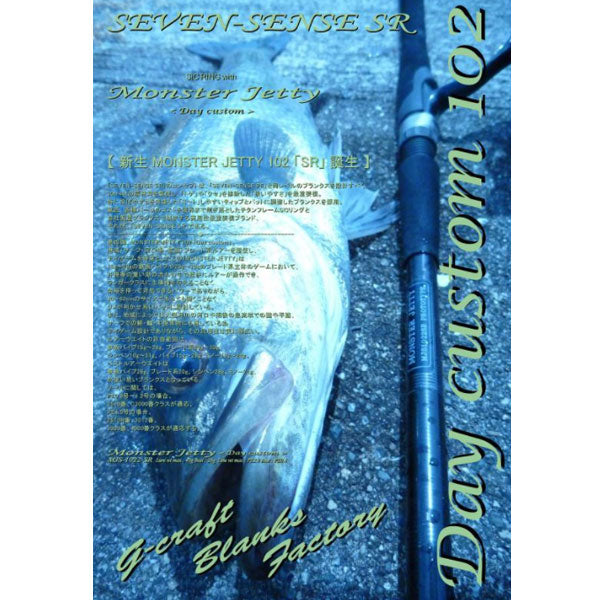 「SEVEN-SENSE SR」のコンセプトは、「SEVEN-SENSE PE」と同レベルのブランクスを設計すべく、30t+40tの原材料を駆使し、「トゲ」や「クセ」を排除した「扱いやすさ」を最重要視。 特に投げやすさを考慮した「ミート」しやすいティップとバットに調整したブランクスを採用。 意匠、各種パーツのコストを限界まで削ぎ落としたチタンフレームSiCリングと自社製造ブランクスで構成する実用性最重要視ブランド、見た目は削るが基本性能は削らない。 「これ以上は絶対に譲れない」それが、「SEVEN-SENSE SR」である。第五弾、MONSTER JETTY 102 「Day custom」。 港湾・サーフ・河口等、鉄板・ブレード系ルアーを駆使し、デイゲームを得意としたこの「MONSTER JETTY」は18g~28gの鉄板バイブや20g~30gのブレード系主体のゲームにおいて、沖提等の重い潮の流れの中で軽快にルアーが操作でき、ランカークラスに主導権を与えることなく余裕を持って対処できるパワーでありながら、40~60cmのサイズであっても弾くことなくタメが利かせ易いバットに設計している。 また、地域によっては大型河川の河口や雨後の急流域での鱸や平鱸、サーフでの鮃・鱸・中型青物にも適している為、デイゲーム設計でありながら、その汎用性は実に幅広い。 ルアーウエイトの許容範囲は、鉄板バイブ15g~28g、ブレード系20g~30g、シンペン10g~31g、バイブ15g~28g、ミノー10g~24g。ベストルアーウエイトは鉄板バイブ26g、ブレード系20g、シンペン28g、ミノー21g、が使い易いブランクスとなっている。 リールに関しては、PE0.8号~1.2号の場合、2510番、C3000番クラスが適応、PE1.5号の場合、2510R番、3012番、3000番、4000番クラスが適応する。水深のある沖提・港湾全域、中規模河川河口域にて小・中・大型全てのスズキを狙い、18g~26g前後の鉄板系、ブレード系をメインに小型シャローミノー、6gジグヘッドワーム等を扱える張り(反発力)のあるティップ部を設計。 バット部に至っては海流の水圧に負けず、ルアーコントロールや着水フォールのバイトをフッキングできるバットを設計。
