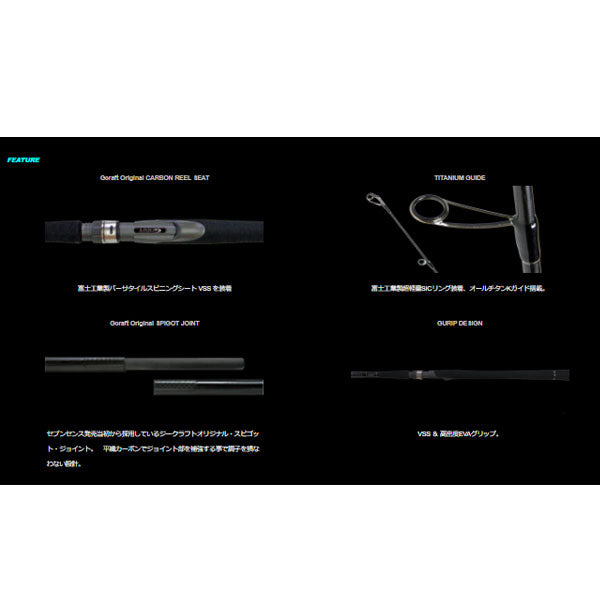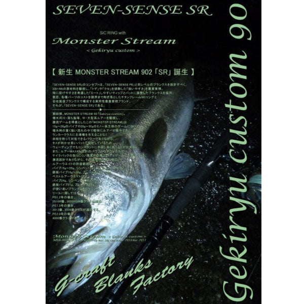 SEVEN-SENSE SR」のコンセプトは、「SEVEN-SENSE PE」と同レベルのブランクスを設計すべく、30t+40tの原材料を駆使し、「トゲ」や「クセ」を排除した「扱いやすさ」を最重要視。 特に投げやすさを考慮した「ミート」しやすいティップとバットに調整したブランクスを採用。 意匠、各種パーツのコストを限界まで削ぎ落としたチタンフレームSiCリングと自社製造ブランクスで構成する実用性最重要視ブランド、それが、「SEVEN-SENSE SR」である。第七弾、MONSTER STREAM 90 「Gekiryu custom」。 増水河川・落ち鮎等、中・大型系ルアーを駆使し、激流ゲームを得意としたこの「MONSTER STREAM」は15g~28gのバイブや20g~30gのミノー系主体のゲームにおいて、増水時の重く強い流れの中で軽快にルアーが操作でき、ランカークラスに主導権を与えることなく余裕を持って対処できるパワーでありながら、タメが利かせ易いバットに設計しているためウェーディングでもコンスタントに手返し良く扱うことが出来る。 また、ルアーMAX40g設計のパワフルなブランクスはテイクバックの取りにくい港湾河川等でのデイゲームにも適している。 激流設計でありながら、その汎用性は実に幅広い。ルアーウエイトの許容範囲は、バイブ15g~28g、シンペン12g~31g、ミノー10g~24g。 鉄板バイブ18g~26g、ブレード系14g~24g、ベストルアーウエイトはバイブ24g、2510R番、3000HGM番クラスが適応、PE1.5号の場合、3012番、3000番クラスが適応する。 PE2.0号の場合、4000番クラスが適応する。 雨後の増水河川、秋の落ち鮎パターン、中規模河川河口域にて中・大型のスズキを狙い、18g~26g前後のミノー、シンペン、バイブをメインに急流から激流域で流れに負けることなく扱える張り(反発力)のあるティップ部を設計。 バット部に至っては、ルアーコントロールを軽快に行え、激流の水圧に負けず確実にフッキングでき、7㎏は片手で溜めつつ余裕を持ってコントロールできるバットを設計。