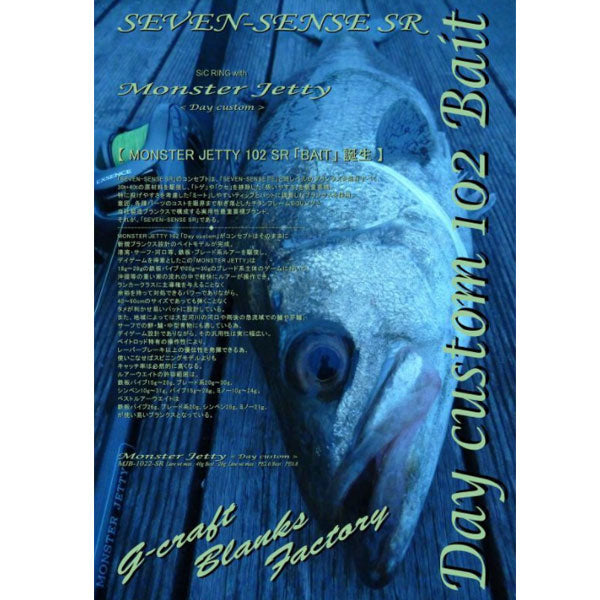 「SEVEN-SENSE SR」のコンセプトは、「SEVEN-SENSE PE」と同レベルのブランクスを設計すべく、30t+40tの原材料を駆使し、「トゲ」や「クセ」を排除した「扱いやすさ」を最重要視。 特に投げやすさを考慮した「ミート」しやすいティップとバットに調整したブランクスを採用。 意匠、各種パーツのコストを限界まで削ぎ落としたチタンフレームSiCリングと自社製造ブランクスで構成する実用性最重要視ブランド、見た目は削るが基本性能は削らない。 「これ以上は絶対に譲れない」それが、「SEVEN-SENSE SR」である。MONSTER JETTY 102 「Day custom」がコンセプトはそのままに新規ブランクス設計のベイトモデルが完成。 港湾・サーフ・河口等、鉄板・ブレード系ルアーを駆使し、デイゲームを得意としたこの「MONSTER JETTY」は18g~28gの鉄板バイブや20g~30gのブレード系主体のゲームにおいて、沖提等の重い潮の流れの中で軽快にルアーが操作でき、ランカークラスに主導権を与えることなく余裕を持って対処できるパワーでありながら、40~60cmのサイズであっても弾くことなくタメが利かせ易いバットに設計している。 また、地域によっては大型河川の河口や雨後の急流域での鱸や平鱸、サーフでの鮃・鱸・中型青物にも適している為、デイゲーム設計でありながら、その汎用性は実に幅広い。 ベイトロッド特有の操作性により、レーバーブレーキ以上の優位性を発揮できる為、使いこなせばスピニングモデルよりもキャッチ率は必然的に高くなる。 ルアーウエイトの許容範囲は、鉄板バイブ15g~28g、ブレード系20g~30g、シンペン10g~31g、バイブ15g~28g、ミノー10g~24g。 ベストルアーウエイトは鉄板バイブ26g、ブレード系20g、シンペン28g、ミノー21gが使い易いブランクスとなっている。