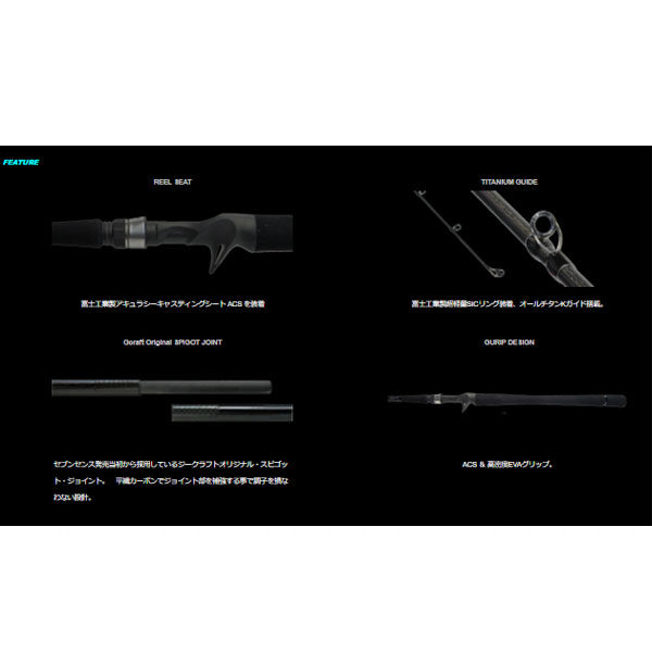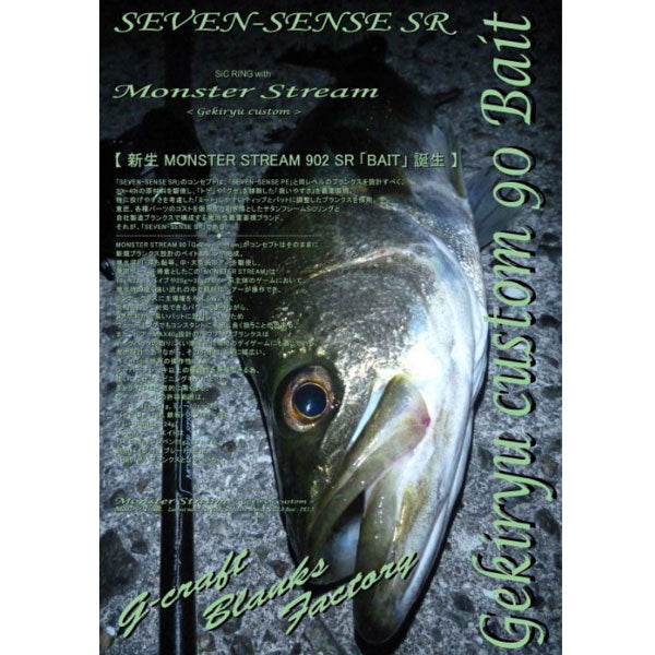 「SEVEN-SENSE SR」のコンセプトは、「SEVEN-SENSE PE」と同レベルのブランクスを設計すべく、30t+40tの原材料を駆使し、「トゲ」や「クセ」を排除した「扱いやすさ」を最重要視。 特に投げやすさを考慮した「ミート」しやすいティップとバットに調整したブランクスを採用。 意匠、各種パーツのコストを限界まで削ぎ落としたチタンフレームSiCリングと自社製造ブランクスで構成する実用性最重要視ブランド、それが、「SEVEN-SENSE SR」である。MONSTER STREAM 90 「Gekiryu custom」がコンセプトはそのままに新規ブランクス設計のベイトモデルが完成。 増水河川・落ち鮎等、中・大型系ルアーを駆使し、激流ゲームを得意としたこの「MONSTER STREAM」は15g~28gのバイブや20g~30gのミノー系主体のゲームにおいて増水時の重く強い流れの中で軽快にルアーが操作でき、ランカークラスに主導権を与えることなく余裕を持って対処できるパワーでありながら、タメが利かせ易いバットに設計しているためウェーディングでもコンスタントに手返し良く扱うことが出来る。 また、ルアーMAX40g設計のパワフルなブランクスはテイクバックの取りにくい港湾河川等でのデイゲームにも適している。激流設計でありながら、その汎用性は実に幅広い。 ベイトロッド特有の操作性により、レーバーブレーキ以上の優位性を発揮できる為、使いこなせばスピニングモデルよりもキャッチ率は必然的に高くなる。 ルアーウエイトの許容範囲は、シンペン12g~31g、ミノー10g~24g、バイブ15g~28g、鉄板バイブ18g~26g、ブレード系14g~24g、ベストルアーウエイトはバイブ24g、シンペン28g、ミノー21g、鉄板バイブ21g、ブレード系20g、が使い易いブランクスとなっている。雨後の増水河川、秋の落ち鮎パターン、中規模河川河口域にて中・大型のスズキを狙い、18g~26g前後のミノー、シンペン、バイブをメインに急流激流域で流れに負けることなく扱える張り(反発力)のあるティップ部を設計。 バット部に至っては、ルアーコントロールを軽快に行え、激流の水圧に負けず確実にフッキングでき、7㎏は片手で溜めつつ余裕を持ってコントロールできるバットを設計。