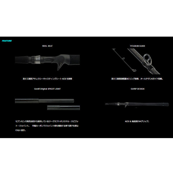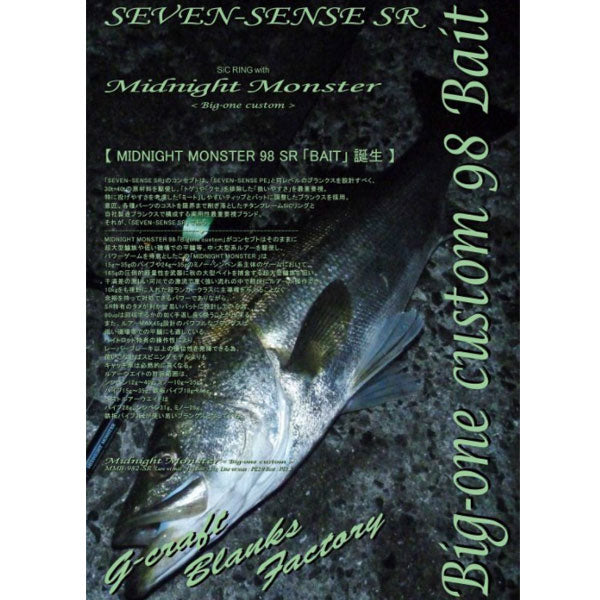 「SEVEN-SENSE SR」のコンセプトは、「SEVEN-SENSE PE」と同レベルのブランクスを設計すべく、30t+40tの原材料を駆使し、「トゲ」や「クセ」を排除した「扱いやすさ」を最重要視。 特に投げやすさを考慮した「ミート」しやすいティップとバットに調整したブランクスを採用。 意匠、各種パーツのコストを限界まで削ぎ落としたチタンフレームSiCリングと自社製造ブランクスで構成する実用性最重要視ブランド、それが、「SEVEN-SENSE SR」である。MIDNIGHT MONSTER 98 「Bigone custom」がコンセプトはそのままに超大型鱸族や低い磯場での平鱸等、中・大型系ルアーを駆使し、パワーゲームを得意としたこの「MIDNIGHT MONSTER 」は15g~35gのバイブや24g~35gのミノー・シンペン系主体のゲームにおいて、165gの圧倒的軽量性を武器に秋の大型ベイトを捕食する超大型鱸族を狙い、干満差の激しい河川での激流で重く強い流れの中で軽快にルアーが操作でき、10kgをも視野に入れた超ランカークラスに主導権を与えることなく余裕を持って対処できるパワーでありながら、SR特有のタメが利かせ易いバットに設計している為、80upは回収するかの如く手返し良く扱うことが出来る。 また、ルアーMAX45g設計のパワフルなブランクスは低い磯場等での平鱸にも適している。 ベイトロッド特有の操作性により、レーバーブレーキ以上の優位性を発揮できる為、使いこなせばスピニングモデルよりもキャッチ率は必然的に高くなる。 ルアーウエイトの許容範囲はシンペン12g~40g、ミノー10g~35g。バイブ15g~35g、鉄板バイブ18g~44g、ベストルアーウエイトはバイブ28g、シンペン31g、ミノー26g、鉄板バイブ35gが使い易いブランクスとなっている。