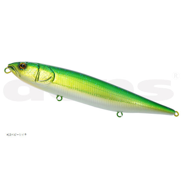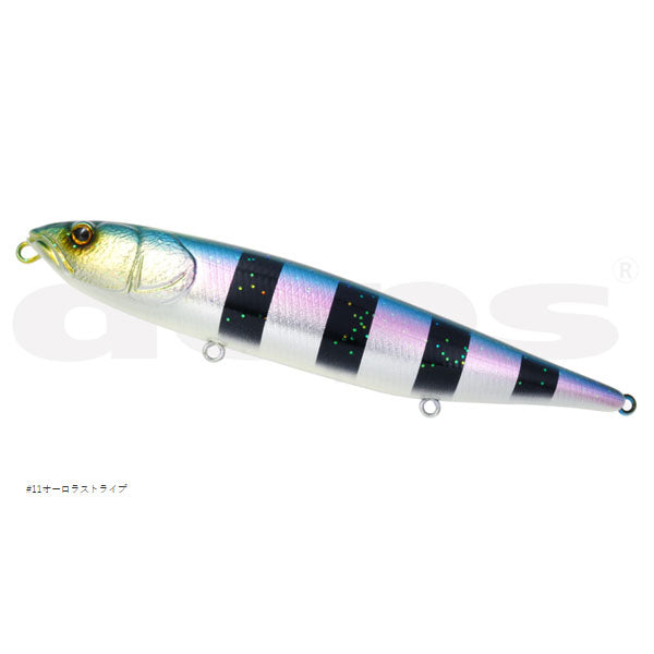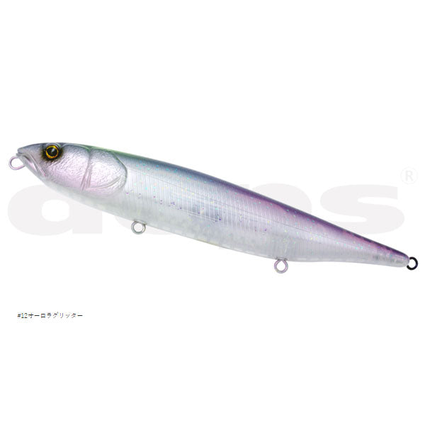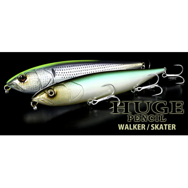 軽快に操れる、マグナムペンシルベイト。 記録級を獲るために生まれたマグナムサイズのペンシルベイト『HUGEペンシル』。200mmオーバーものボディが水面で放つ凄まじい波動は、あたかも逃げ惑うベイトやベイトを捕食するフィッシュイーターのフィーディングシーンを演出することで、水面直下をトレースするビッグベイトでは反応しなかった、その水域に生息するデカバスの捕食本能を刺激してくれます。水押しの強い“ウォーカー”と軽快なスケーティングをみせる“スケーター”がラインナップされ、フィールドの状況にアジャストさせることができます。マグナムサイズからなるアクションのもたつきは、内部容量を拡張させた高浮力化によりキレのあるアクションに変換。またサウンドタイプには不規則なアクションと独自サウンドで惹き付けるバリアブルバランサーシステムにより、高い集魚効果を発揮してくれます。『HUGEペンシル』は、バスをはじめアカメやシーバス、咬合力の高い怪魚にも効く釣獲力を持つため、貫通ワイヤーやフックアイにスイベルが採用され、掛けた魚を獲りこぼさないスペックを持つ。■スケーター 水平に近い浮き姿勢により、振り幅の広いスケーティングを得意とするモデル。入門者でも扱いやすく、上級者には意のままに操れる汎用性を持ち備えるとともに、軽い引き感が手首への負担も軽減してくれます。