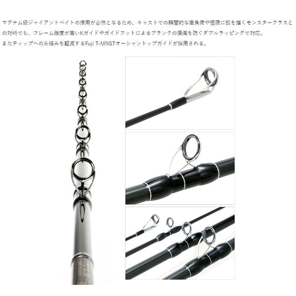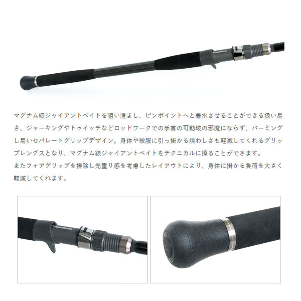 マグナム級ジャイアントベイトを操る、テクニカルロッド。 いまやジャイアントベイトは、琵琶湖やリザーバーなどビッグレイクだけではなく野池や河川、またボートやオカッパリでも幅広く使用されているシーンがみられる。そんななか年々巨大化するジャイアントベイトだが、ただキャストして泳がせるだけではバスは反応するわけではない。無論ジャイアントベイトもミノーやクランクなど様々なルアーやワームと同様に、そのルアーが持つポテンシャルを十分に引き出し操ること、またバイトするであろうポイントへのトレースや着水させることが必要となるが、重量級のジャイアントベイトとなると、思っている以上に簡単ではない。そこで重量級のジャイアントベイトのポテンシャルを引き出せるスペックと操作性を求め、ジャイアントベイトすらオーバースペックに感じてしまう、超絶パワーロッド「ストロングマインド」をベースに、よりルアーが持つポテンシャルを引き出しロッドワークで操れるブランク、より狙い澄ましてポイントへ着水させるキャスタビリティ性能を高める扱い易さ、そして様々なフィールドで使用できるよう携帯性を考慮したレングスで仕上げられた、マグナム級ジャイアントベイト用テクニカルロッドが『ストロングジャーク』です。