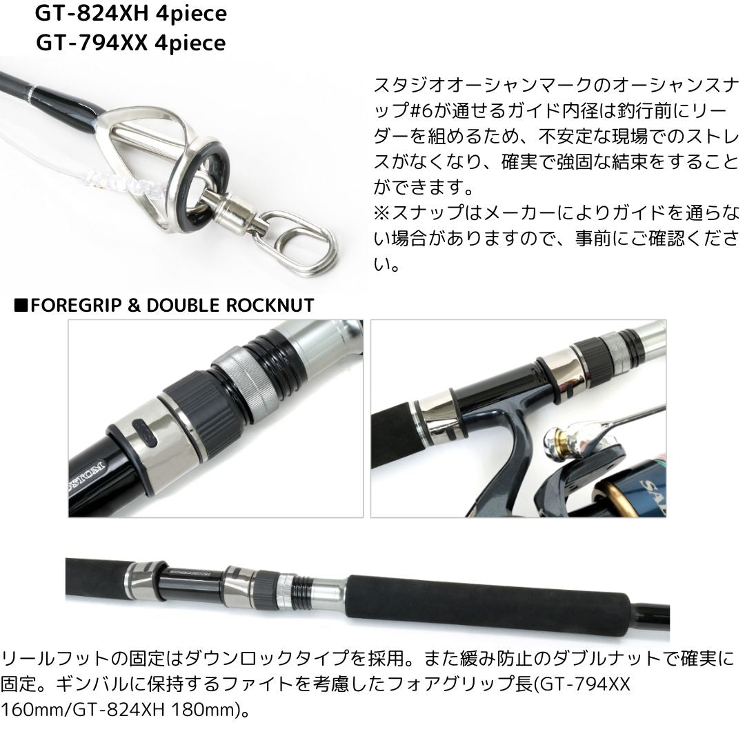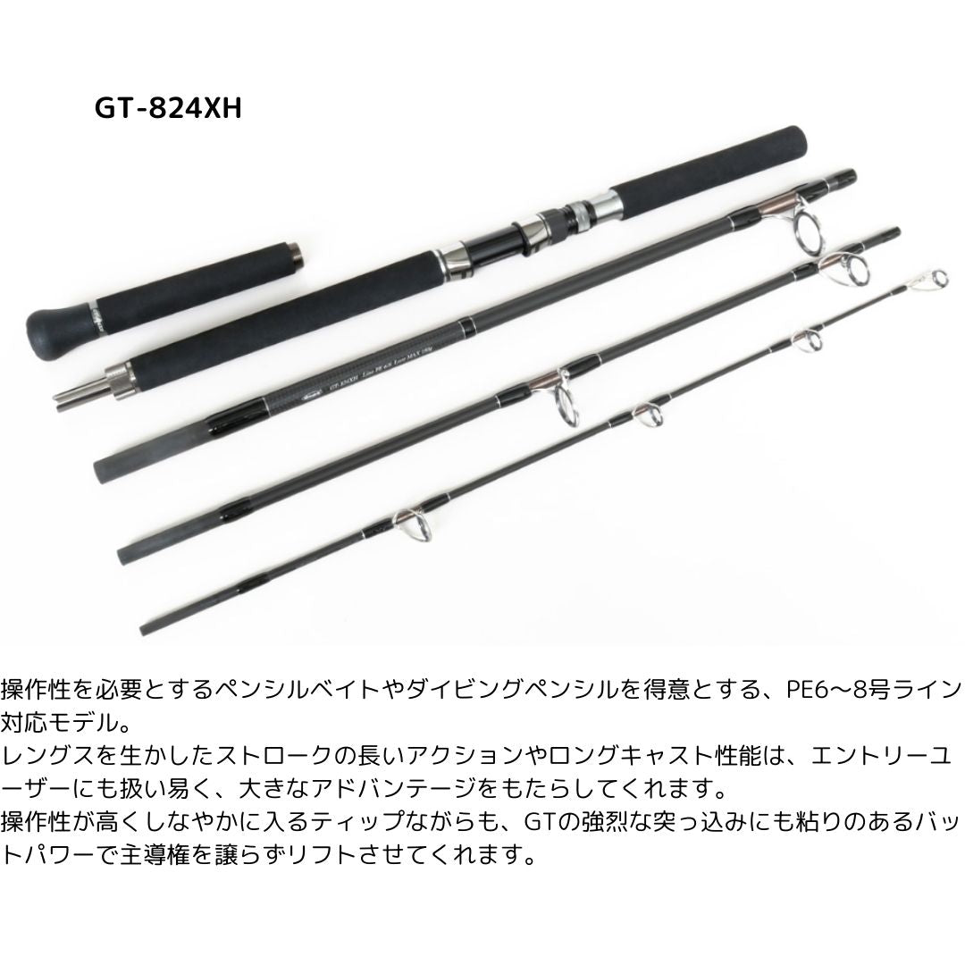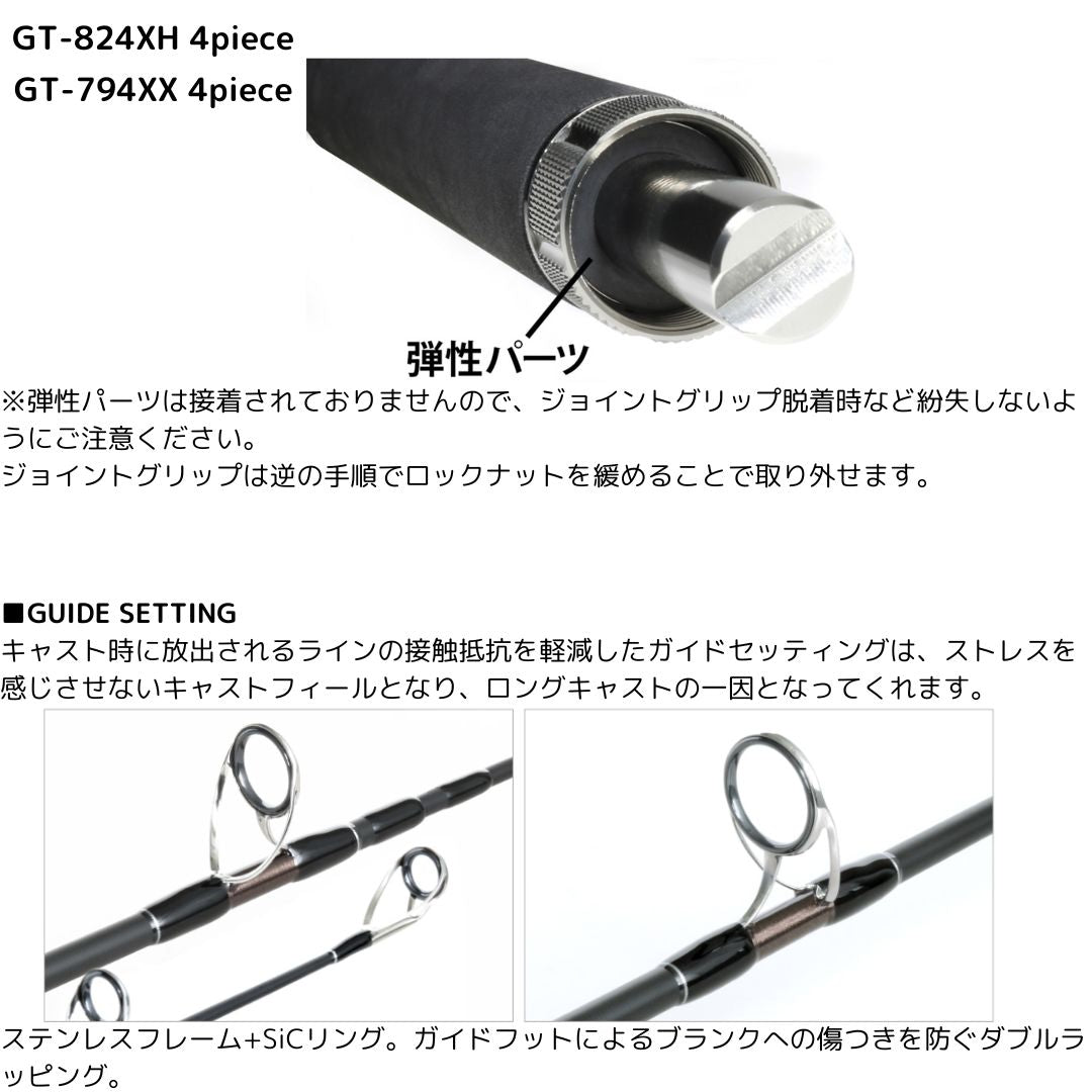 GT-824XH | スピニング | 8.2ft(2490mm) | 4本 | 1745mm | 648mm | 15kg | 460g | 790mm(ジョイントグリップ含む) | 180mm | 450mm(ジョイントグリップ含む) | 210mm | 16.1/3.5mm | MAX 180g | PE6/8 | 88% |