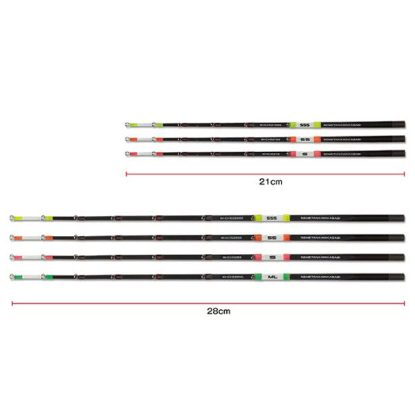 カーボン特有の極感度、先調子 カーボンを板状に薄く加工した扁平タイプの高感度穂先。グラス素材に比べ張りのある先調子。カーボンならではの感度の良さで繊細なワカサギのアタリもダイレクトに伝わります。氷上でも見やすいカーボンブラックカラーとトップ部はホワイト塗装、蛍光カラーの糸巻きで視認性抜群。元径5mmと汎用性が高いので、攻棚ワカサギ電動リールはもちろん様々なリールに使えます。21cm・28cmの2レングス、SSS〜MLの4アクション、合計7ラインナップ。