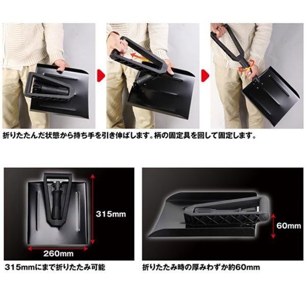 持ち運びに便利な折りたたみ式の軽量雪かきスコップ なにかと荷物の多いワカサギ釣りに嬉しい折りたたみ式の雪かきスコップ。260×315(mm)の小ささまで折りたたむことが出来ます。専用の収納袋付きのため持ち運びラクラク。丈夫なハードアルミ合金を採用し、重さ870gと軽量。車に積んでおいても便利なコンパクトな折りたたみ式雪かきスコップです。