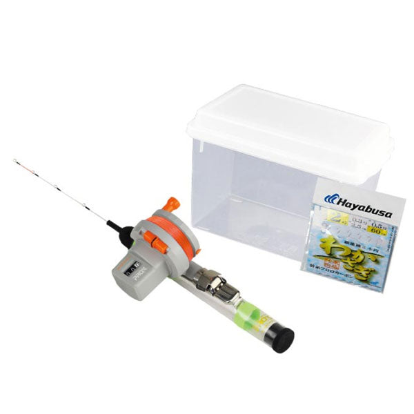 竿+カウンター+仕掛が水槽に入った入門セット ワカサギを始めるために必要なアイテムが揃うスターターセット。並継竿34cm・カウンター付リール・仕掛・水槽の4点セット。穂先と汎用性の高い5mm元径に適合するグリップ。穂先はトップ側が視認性の良いオレンジ塗装。両軸リールは10cm刻みで計測可能なカウンター、便利な棚停止フック付。3.4Lの水槽はワカサギのドロ吐かせすための活かしバケツに最適。フタ付なのでタックルボックスとしても使用可能。仕掛けまで付いているのであとはエサを買うだけ。ワカサギ釣りをスタートしたい方にピッタリのフィッシングセットです。