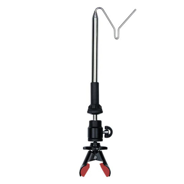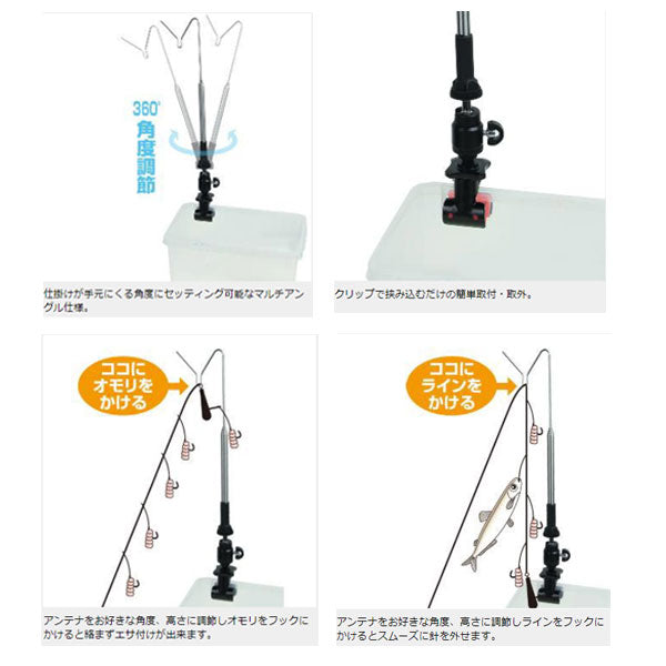 お好み角度に調節可能なワカサギ仕掛けハンガーの万力式 針数の多いワカサギの仕掛けが絡まない絡み防止ハンガー。仕掛けが手元にくる角度に調節できるマルチアングル。クリップを万力ではさみこむだけの簡単取付・取外。オモリをアンテナのフックにかけるだけで絡まずエサをつけられます。アンテナフックに道糸をかけておけば、仕掛けが絡まずワカサギを針から外せます。アンテナ部はマグネットで簡単に取り外せるので、氷や桟橋にひっかかった針なども外せます。15.5cm〜83cmまで8段階の伸縮が可能。お好きな高さにセッティング。仕掛けが絡まず手返し抜群、釣果に繋がるワカサギ仕掛け用ハンガー。マルチアングル万力式(クリップ止め)モデル。