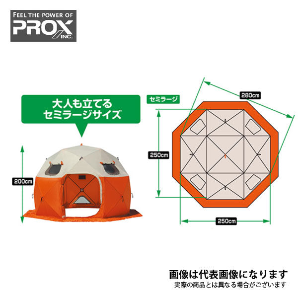 簡単に設置可能なテント。12箇所ある紐を引くだけの簡単設置。一番最初に引く天井の紐はオレンジ色、その他は黒で色分けされています。強度のあるグラスファイバーフレームをクロスさせた正方形が12面集まり、8角形のドーム型テントとなっています。そのため、どの方向から風がふいても安定感がある耐風性の高い構造を実現しました。8角形のため、デッドスペースが少なく広々とした空間が確保出来ます。出入りがラクな広めの出入り口設計。扉1カ所・窓4カ所・通気口3カ所のすべてに開け閉め可能なメッシュを装備。一酸化炭素中毒を防ぐだけでなく害虫の侵入を防ぐのでキャンプやグランピングなどでも活躍します。持ち歩きに便利な背負える収納バッグは大口の巾着タイプで出し入れも簡単。収納は12箇所を押込んで束ねるだけ。コンパクトなレギュラーサイズ、大人が立てるセミラージサイズ、みんなで広々ラージサイズ、釣行人数に合わせて選べる3サイズをラインナップ。荷物が多く、厳しい環境の多いワカサギ釣りに嬉しい、簡単設置。ワカサギ釣りをはじめ、キャンプやグランピングでも使えます。大人がテント内で立てるセミラージサイズ。