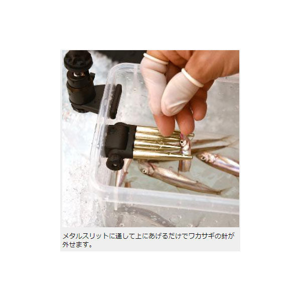 ネジでバケツに取り付け!オールインワンワカサギ外しの替クローにも! 手を汚さずにワンタッチでワカサギを針から外せる針外し。スリット部分が軽量で丈夫なアルミ製。チモト部分を金属スリットに通し、そのまま上に引き上げるだけで簡単にワカサギが外せます。スリット部分は、外しやすい角度に調節可能。お手持ちのバケツのお好きな位置に付属のアダプターでセッティング出来ます。また、オールインワンワカサギ外しやワンタッチワカサギ外しアイアンクロー(万力式)のスリットと交換が可能。スピーディーにワカサギが外せる釣果アップ間違いなしの便利ツールです。【セッティング方法】1)本体とアダプターで穴を開けたバケツ等を挟み固定ネジで取付けます。2)角度調節ネジで外しやすい角度に調整して下さい。