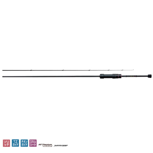 S57UL-solid 標準全長(cm/ft)170(5'7") 標準自重(g)42 仕舞寸法(cm)89.5 パワー UL 使用材料(%)C99.9G0.1 継数(本)2 ルアーウエイト(g)0.1~2.5 適合ライン(PE/号)0.1~0.3 適正ライン(ナイロン/lb)0.8~2 先径(mm)0.6 グリップ長(mm)185