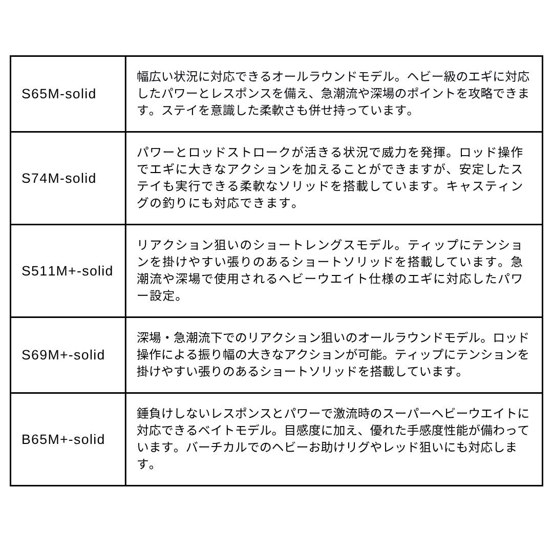 ソリッドタイプの先端部はアクション上、繊細なカーボンソリッド(チューブラとの継穂)を使用しております。先端の一部に荷重が集中しますと、破損の原因となります。ラインのカラミ、ケースなどの収納時、移動などの取り扱いには十分ご注意ください。