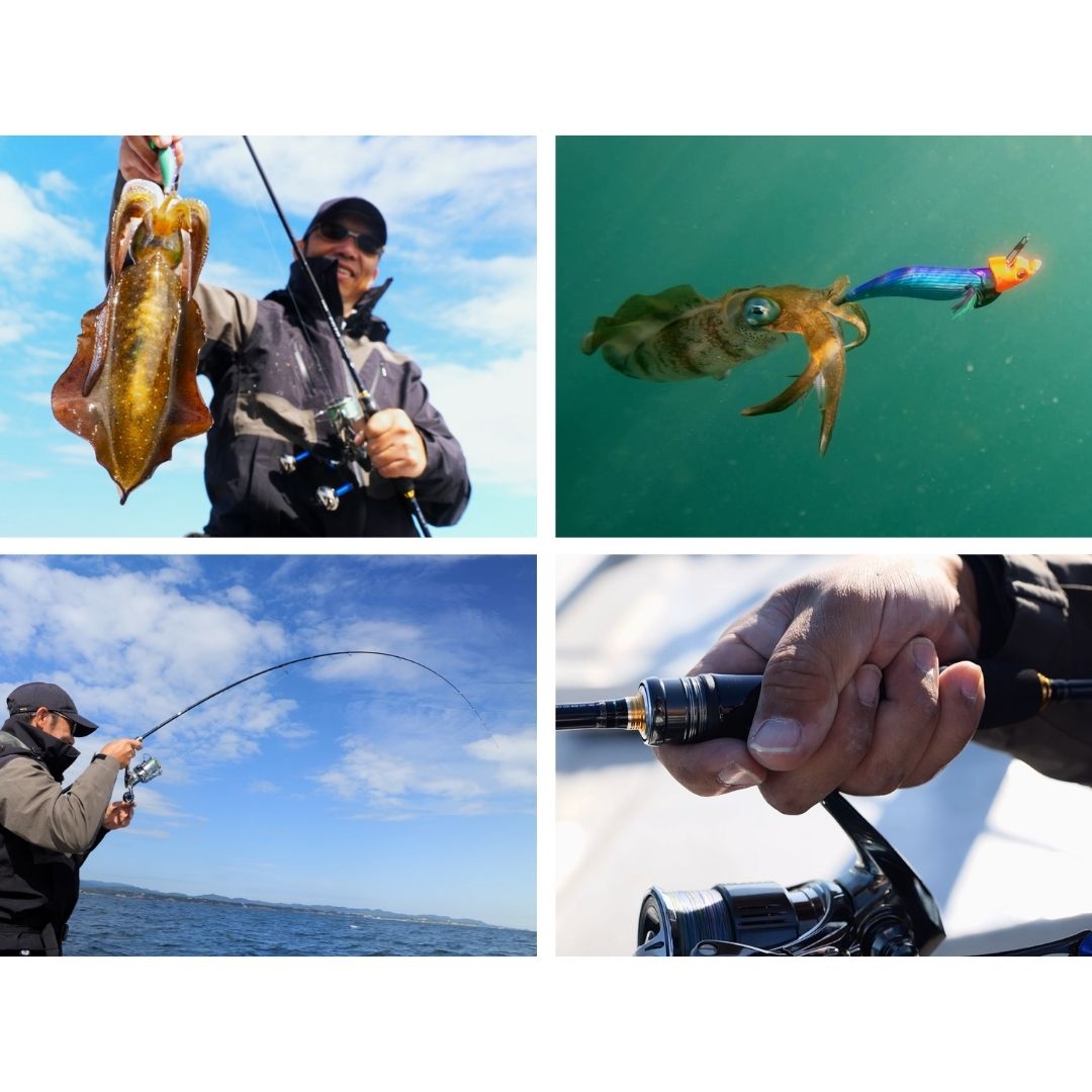 年々、激化するティップランシーンに対応するべく、EGTR Xが更に高感度になって進化しました。メインマテリアルにTORAYCA(R)T1100Gを採用。適所に高弾性マテリアルを配し、細身・軽量のブランクに仕上げました。ティップ部にはオリジナルテーパーデザインのソリッドを搭載し、モデルごとに最適な表現力を備えます。反響感度・荷重感度性能を高める中空構造の「リザウンドグリップ」が、アオリイカの繊細なアタリを逃さずとらることに重要な役割を担っています。また、リールシートの素材には「タフライト」を使用したことで、軽量化をもたらし操作性を高めています。ベイトモデルは穂先ブレ軽減、スムーズなライン放出、糸絡み軽減、ガイド個数の最適化、ブランクの性能を最大限に発揮できるオールシングルスパイラルガイド設定です。スピニングモデルも小径化のガイドセッティングでブレを極力抑えた設定にしています。多彩なラインナップで、多種多様な状況を自在に攻略可能です。