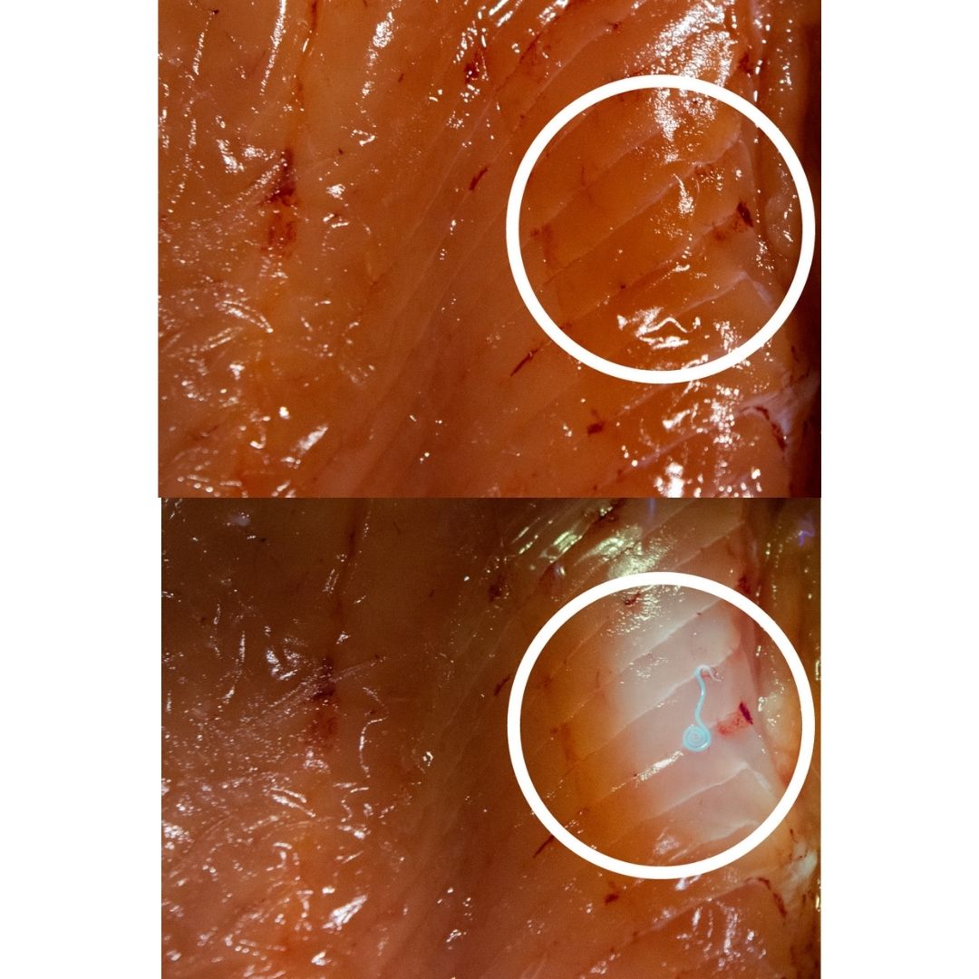 この強い光でアニサキスの検出、蓄光塗料の発光など様々な高い効果を発揮します。暗い所で使用するとさらに分かりやすいです。