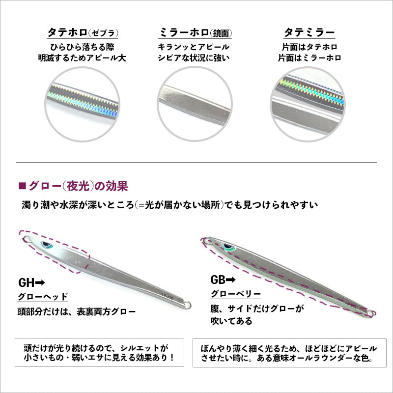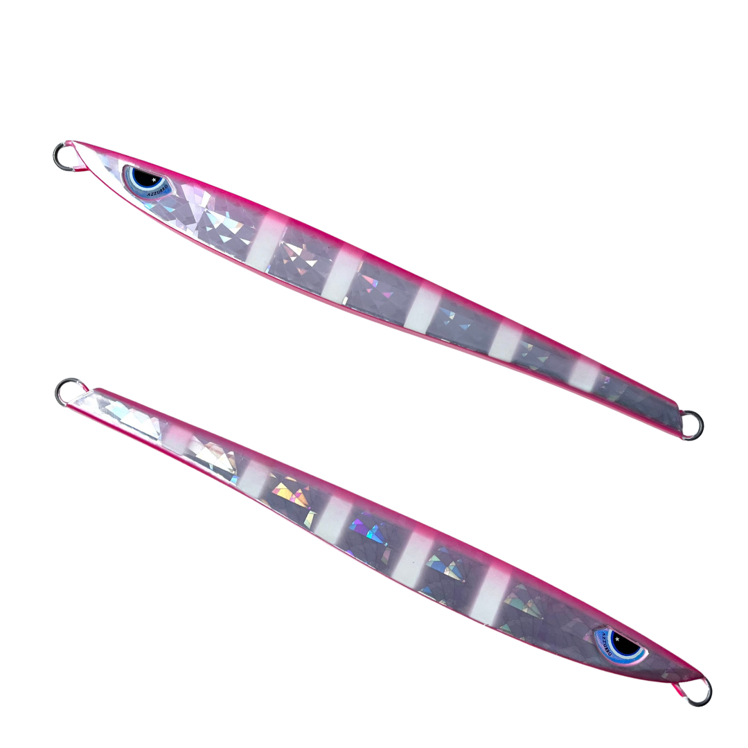 ・クラッシュホロゼブラピンクエッジ・・・定番のゼブラを表裏ともに吹いた昨今の人気カラー。エッジをピンクで強調したカラー。タチウオジギングでもぜひ使ってみたい最強カラー。
