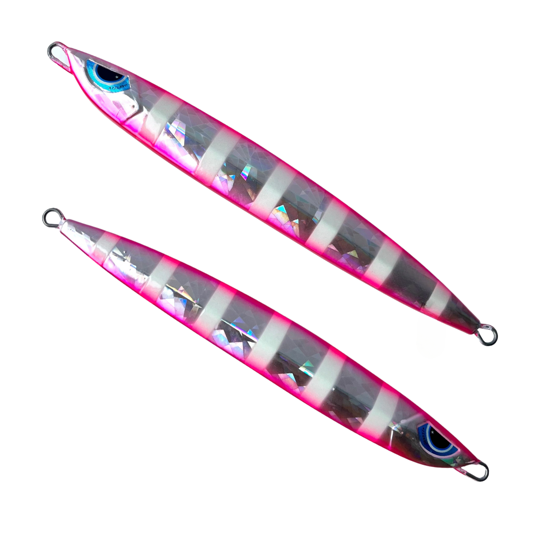 ・クラッシュホロゼブラピンクエッジ・・・定番のゼブラを表裏ともに吹いた昨今の人気カラー。エッジをピンクで強調したカラー。タチウオジギングでもぜひ使ってみたい最強カラー。