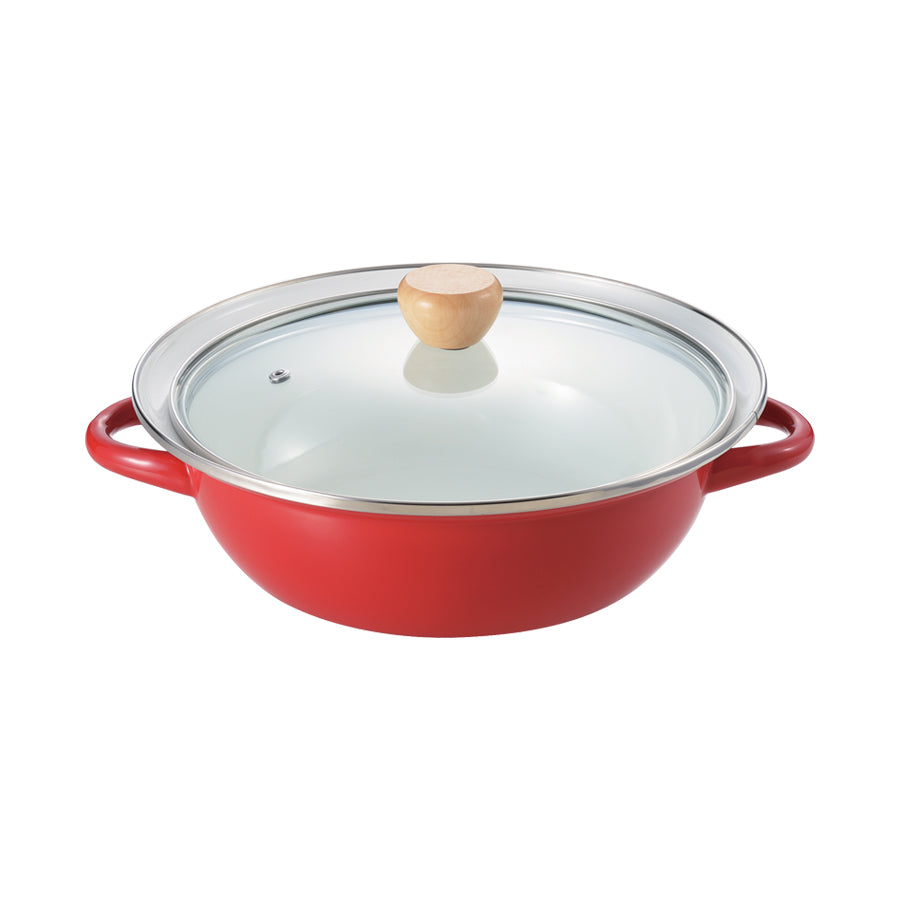 ■材質:表面加工/ほうろう 本体:ほうろう用鋼板(底の厚さ1.0mm) 取っ手:ほうろう用鋼板 本体枠部:ステンレス鋼 (ふた)品名/強化ガラス製器具 強化の種類/全面物理強化 その他/縁リング:ステンレス鋼 つまみ:天然木