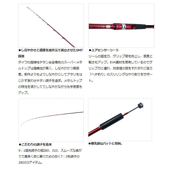 こだわりのヘチ竿がさらに進化、しなやかさと感度を高次元で両立させたSMT採用。 1.しなやかさと感度を高次元で両立させたSMT採用。2.X45、V-JOINT、HVFナノプラス採用で、操作性の良い細身かつ軽量ながら、パワーを兼ね備える。3. DAIWA伝統のヘチ調子を伝承する9:1超先調子の極280、310、スムーズな曲がりで素早く胴に乗りための効く7:3先調子の280の3アイテム。4.並継ぎ変則3本継ぎ設計。1番節を元竿下栓に固定収納でき持ち運びに便利。5.パイプシートタイプのエアセンサーシートによりリールの固定力、グリップ感を向上し、感度と軽さもアップ。6.スクリューシートはリールのホールド性が高く、EVA素材を使用しているのでグリップ力に優れ、防波堤の際をすれすれに狙う「ヘチ釣り」のスリリングなやり取りをサポート。