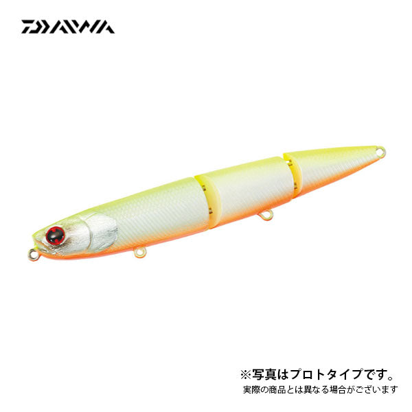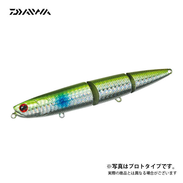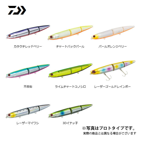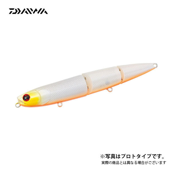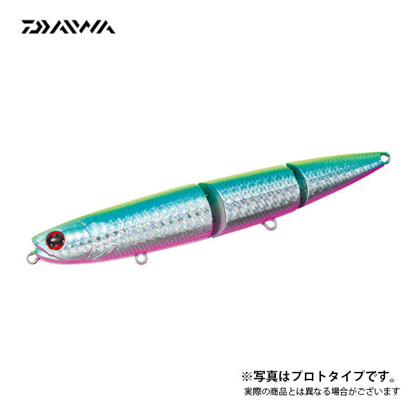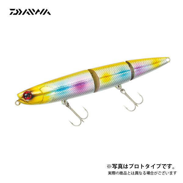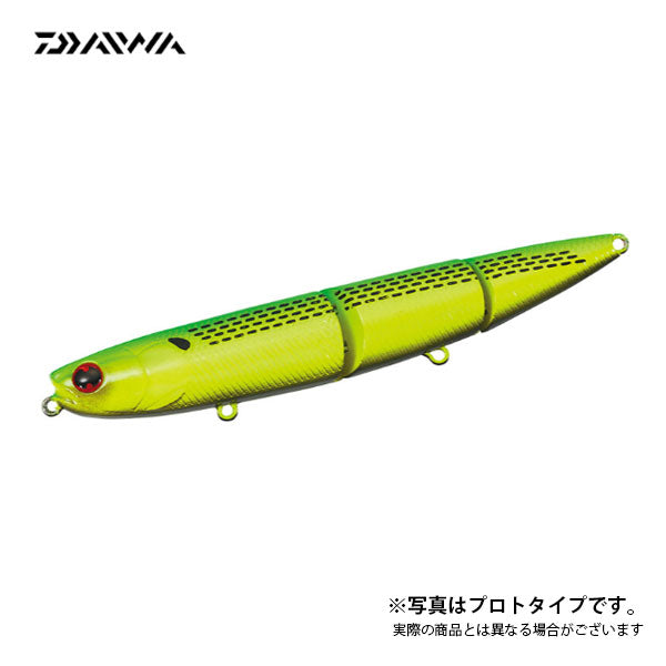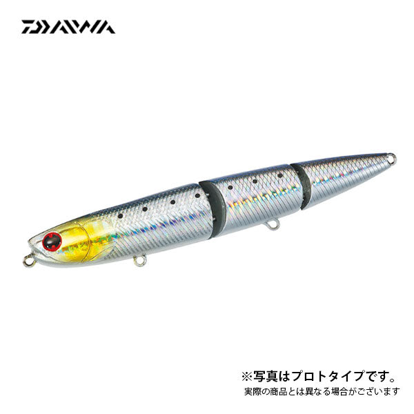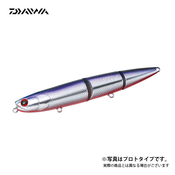 固定重心ながら安定した飛行姿勢を実現。違和感無くスムーズにうねる2点支持ジョイント構造。 水中をスネークスラローム+イレギュラースライドで誘えるシンキングペンシル120S(120mm20g)タイプ。テール先端のアイはレスポンス重視で通常は何も付けていませんが、フェザーを付けるとよりワイドかつスローなアピールアクションに、トレブルフックを付けてアクションをタイト且つフッキング率を上げたり、ブレードチューン等アレンジが可能。