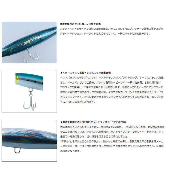 プラスチックダイビングペンシルのあるべき姿を求めて、妥協なき開発魂で誕生させた至高の逸品。2020年ソルティガトッププラグプロジェクト、本格始動。 ダイブ★スターはその開発に2年の歳月を掛けて完成させた絶対の自信作。 誰よりも遠くに飛ばし、どんな海況でもミスのない安定したアクションを実現させること。この命題を完遂するのに本当に長い時間かかってしまいました。 まずは、この感動をフィールドで体感してください。本当に戦えるトップルアーを作りたい一心で完成させたダイビングペンシル、ソルティガ ダイブ★スター220F。完成に至るまでに幾多の大きな壁にぶつかり、そのたびに挫折感を味わい、諦めかけたビックゲーム用トップウオータープラグ。満を待しての発売となります。
