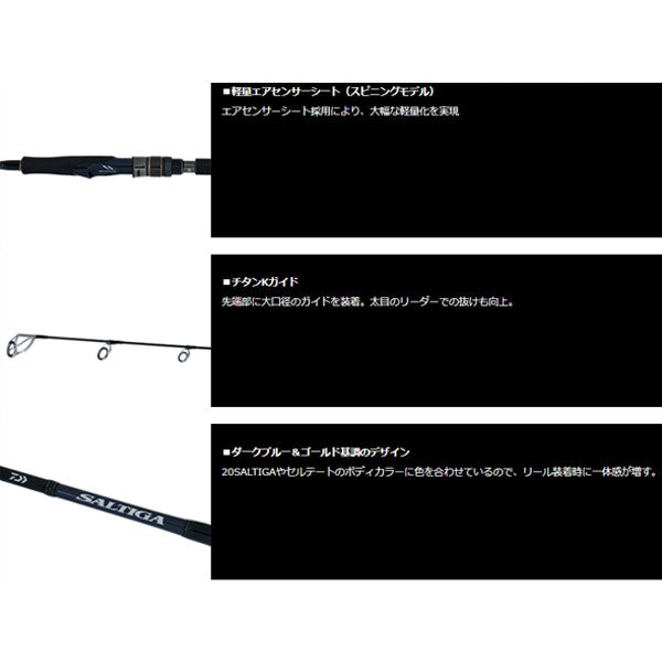 ■使用クラスラインは同じでありながら、3タイプの異なる弾性を使い分けることで、ジャークパターン、ジグ形状、船の流し方に応じて、戦略的にレスポンス(Response=R)を使い分けることを可能にした新シリーズ。細身軽量のブランクは、HVFナノプラスを採用し、さらにX45をティップから最外層にも巻くことで安心して扱える粘り強さを持ち、近海の青物狙いで活躍するモデルとなっている。SALTIGA R J56S-4 HI(ハイレスポンス) スピードジャークメインのハイレスポンス軽量スピニングモデル ショートレングス&高弾性素材によるハイレスポンスモデル。PE4号まで対応し、外房などのシャローエリアでのヒラマサ狙いにおいて、広範囲をキャスト&ジャークで狙うのに適したモデル。メインの6ftクラスのロッドを比べるとかなり短めの設定になるが、アンダーハンドでのキャストもしやすく、ダイレクトな操作・ファイトが味わえる新機軸のジギングロッド。