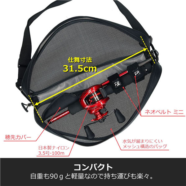 リール、ロッドをコンパクトに収納出来る両面メッシュ構造ソフトキャリーバック付き。ロッド:仕舞寸法32cm、全長130cmの振出仕様。ベイトリール:日本製ナイロン3.5号-100m付き、軽量190g、ギア比6.3。MAGFORCEブレーキ搭載