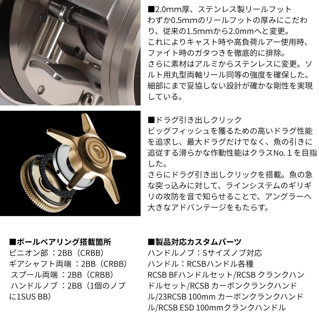 標準自重(g):265 巻き取り長さ(cm/ハンドル1回転):56 ギア比:5.3 標準巻糸量ナイロン(lb-m):12-100, 14-90, 16-80 標準巻糸量PE(号ーm):2-150, 3-90 ハンドルアーム長(mm):90 ベアリング(ボール/ローラー):8/1 最大ドラグ力(kg):6 スプール寸法(径mm):34 スプール寸法(幅mm):24 ハンドルノブ仕様:HG-Iシェイプパワーラージノブ ハンドルノブ交換サイズ:S ボディ素材:AL ギア素材:高強度真鍮 使用環境:ソルト対応 JAN:4550133217210
