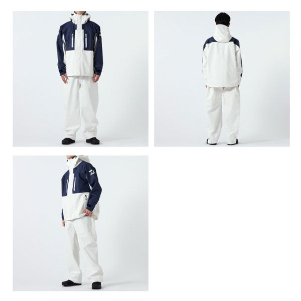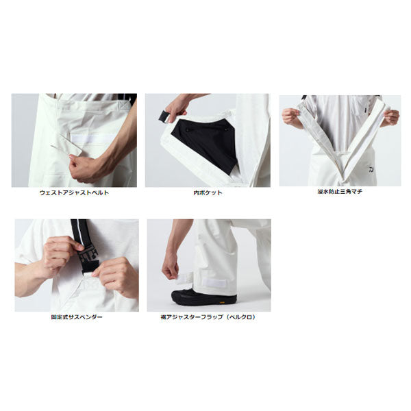 船釣りに最適なPUレインスーツ。海水や汚れが染み込まず、お手入れも簡単。 しなやかで動きやすく、汚れを落としやすいPU素材を全面に採用。フードにはキャップインシステムを搭載。対応キャップと合体し、フードと頭部の動きを同調させることで視界を確保。アジャストベルト搭載でフード先の前後位置を調整可能。袖口は水の浸入を軽減する2重袖口仕様。脇/胸ポケット部には水の浸入を軽減する止水ファスナーを採用し、収納物の濡れを最小限に抑える。パンツは防水性の高いチェストハイサロペット仕様(サスペンダー付き)。パンツのウエスト両脇にアジャストベルトを装備。ウエストのフィット感を素早く調整可能。パンツ内側(右のみ)に収納ポケットを搭載。フロントファスナーからの水の浸入を防止する三角マチを搭載。