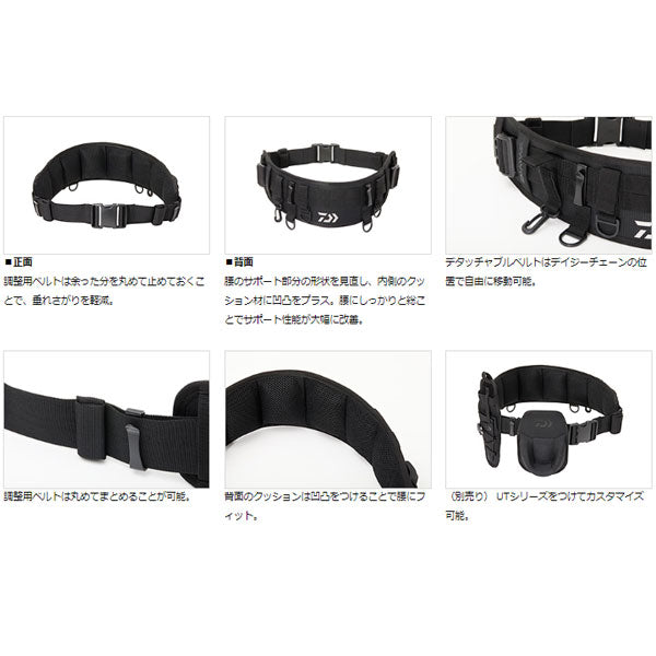 釣りに合わせてカスタマイズ可能なフィッシングベルト。安心の腰サポートクッション装備。(NEW)腰サポート用調整ベルトを身体前側に引く仕様に改良。ホールド感が大幅UP!!(NEW)DF-2222腰巻き式ライフジャケットを背面に装備可能。※1(NEW)背面にデイジーチェーンを配備し、オリジナルカスタマイズが可能。■釣種を問わず使用が可能なフィッシングベルト。■ワンタッチで着脱可能なフロントバックル採用。■50mm幅ベルト&背当てパッドで快適なホールド力実現。■デタッチャブルベルト調整カン2個付+ナスカン1個付。(※1)DA-4322背面のフックにDF-2222のデイジーチェーン仕様を引っかけることで合体が可能。腰巻式ライフジャケットとの併用ができます。 (合体の際はDF-2222のフロントバックルを必ず留めて下さい。)