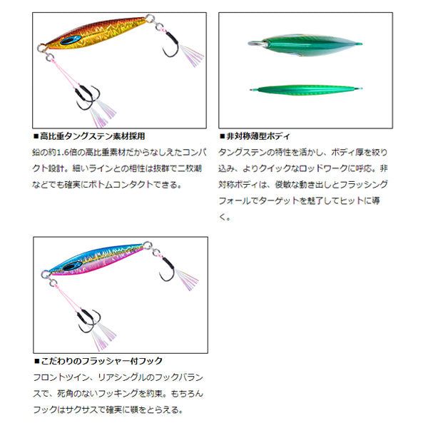タングステン素材を最大限生かしたFK(フォールキラー)スーパーライトジギングモデル。 フォールのフラッシング性能に特化したタングステン製FKジグにベストバランスのフックをセットアップしたモデル。ポイントまでの早いフォールスピードとレンジでのフラッシング性能の融合を目指し、完成させたタングステンジグ。コンパクトなシルエットがSLJの新たな世界を切り開きます。