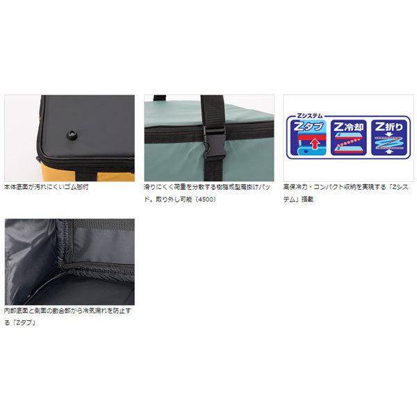 ハードクーラー開発半世紀の技術をソフトクーラーに投入。高保冷でコンパクト折り畳み可能なソフトクーラー。 カラー新たに新登場(モカ、アンバー、ディープフォレスト)。用途に合わせて選べる4サイズ、各3色展開。地熱をカットする20mm厚底断熱材採用で高保冷を実現(壁面の断熱材厚さは10mm)。600mlペットボトル縦置き収納可能(4500:34本、2600:24本、1500:14本、800:6本)。2Lペットボトル収納可能(4500:12本、2600:8本、1500:6本)。買い物カゴやマルチバスケット(別売)をそのまま収納可能(4500、2600)。高保冷力・コンパクト収納を実現する「Zシステム」搭載。内部底面と側面の勘合部から冷気漏れを防止する「Zタブ」。内容物を上下から効率よく冷やす「Z冷却」。断熱材が厚くても折り畳みを可能にした「Z折り」。氷や魚をそのまま収納できるPVCインナー。ワンタッチで装着でき丸洗い可能。