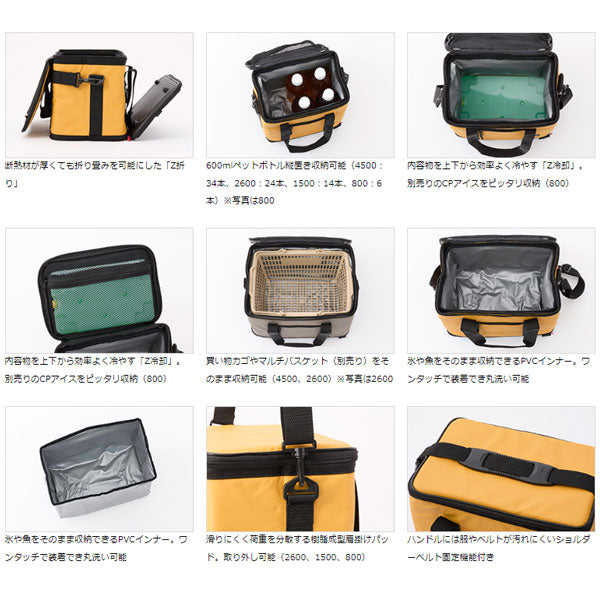 ハードクーラー開発半世紀の技術をソフトクーラーに投入。高保冷でコンパクト折り畳み可能なソフトクーラー。 カラー新たに新登場(モカ、アンバー、ディープフォレスト)。用途に合わせて選べる4サイズ、各3色展開。地熱をカットする20mm厚底断熱材採用で高保冷を実現(壁面の断熱材厚さは10mm)。600mlペットボトル縦置き収納可能(4500:34本、2600:24本、1500:14本、800:6本)。2Lペットボトル収納可能(4500:12本、2600:8本、1500:6本)。買い物カゴやマルチバスケット(別売)をそのまま収納可能(4500、2600)。高保冷力・コンパクト収納を実現する「Zシステム」搭載。内部底面と側面の勘合部から冷気漏れを防止する「Zタブ」。内容物を上下から効率よく冷やす「Z冷却」。断熱材が厚くても折り畳みを可能にした「Z折り」。氷や魚をそのまま収納できるPVCインナー。ワンタッチで装着でき丸洗い可能。