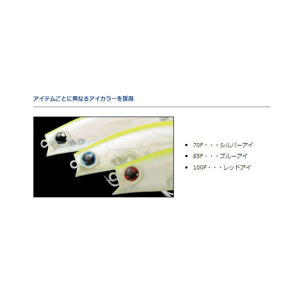 「湾奥のプリンス」大野ゆうき監修 河川・干潟・港湾とフィールドを選ばずキャストできるフローティングミノ-シリーズ 足元のスーパーシャローに潜むランカー狙いから、飛距離を必要とする遠くのピンポイント攻略まで幅広く対応するフローティングミノー。体高のあるボディは流れの変化を敏感にキャッチし、アクションバランスを半自動的に崩すことでシーバスの意識を捕食モードへと駆り立てる。超低速~中速の流れを得意とし、スローピッチなウォブリング&ローリングアクションで水中を優雅に泳ぐ小型ベイトフィッシュをイメージ。またジャークによる足の長いダートアクションは水面直下を逃げ惑うベイトフィッシュを演出し、ステディリトリーブでは食わせることのできないシーバスに口を使わせる。理想の浮力、レンジ・アクション・スピードをキープしつつ、ギリギリまで追求したウエイトバランスによって、フローティングにしてこのサイズからは想像できない飛距離とキャストフィールを実現。実釣時の余計なストレスを排除し、「飛距離」というアドバンテージを得たことで、より釣果につながる確率を高めた。フックはボディのボリュームに合わせ、且つフッキングのバランスもとれたサイズを装備。