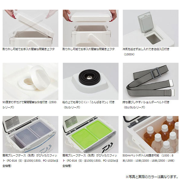 ダイワクーラーボックスの定番シリーズがリニューアル。座れて便利。使い勝手の良い両開き上フタ。 対象魚に合わせて選べる4サイズ(10L、15L、20L、25L)取り外し可能でお手入れ簡単な両開き上フタ ガッシリ座れる剛性ボディ(リブ構造を採用) 冷気を逃さず出し入れできる投入口付き(末尾Xシリーズ) 90度まわすだけで開閉簡単 水栓付き(2500シリーズ) 用途に合わせて選べる断熱仕様(1面真空、ウレタン、スチロール)船の上でも滑りにくい「ふんばるマン」付き(SUシリーズ) 持ち運びしやすいショルダーベルト付き(GU/SUシリーズ) 専用プルーフケース(別売)がぴったりフィット(PC-816(S)は1000/1500、PC-1020αは全機種) 500mlペットボトル縦置き可能 (1000:8本,1500:10本,2000:18本,2500:19本)