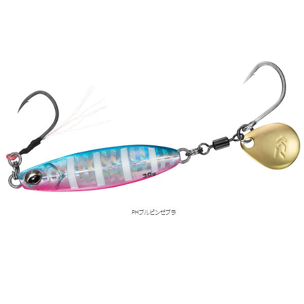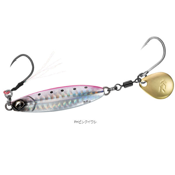 サワラキャスティングゲームはもちろん、根魚や青物狙いに効果的なオールシーズン対応ブレードジグ! 人気のサワラブレードジギングに対応するコンパクトジグ。安定感抜群の低重心ボディと小型ブレードで超早巻きに対応。ブレードのキラメキと波動がサゴシ、サワラに効果を発揮。また、フロントアシストを搭載しているため、根魚や青物などをターゲットとしたショアスロージギングにも対応。早巻きだけではなく、スローな誘いもできる多目的ジグ。フックは、フロントにティンセル仕様のサクサスアシストフック、リアには大物の強い引きにも耐える太軸シングルフックを搭載。しっかりと深く刺さりバレを軽減する。