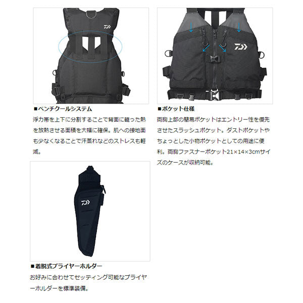 ロックショアに求められる運動性・機能性を両立させたモデル ■一日中ロッドをキャスティングし続けるシーンにおいて、肩の負担を軽減させる、ダブル調整ベルト方式を採用。■ダイワオリジナルベンチクール機構を搭載し、背面の放熱性を高める。■フロントの設計はルアー操作時にベストと腕が干渉を抑えたカッティング。■両胸に簡易ポケットとファスナーポケット、計4個のポケットを搭載。■プライヤーホルダーケース標準装備。■浮力:7.5kg/24h以上