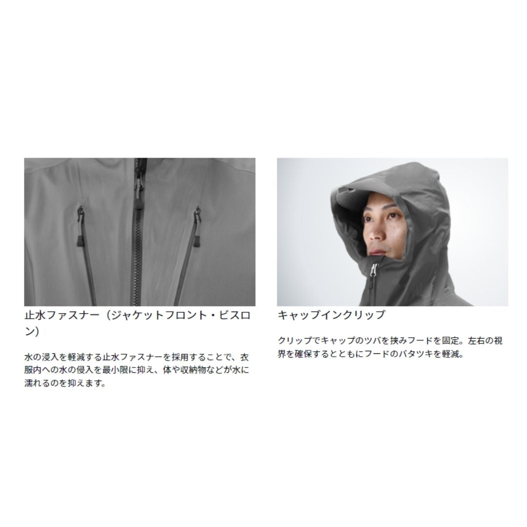 各所ポケットには水の浸入を軽減する止水ファスナーを採用し衣服内の濡れを最小限に抑える。