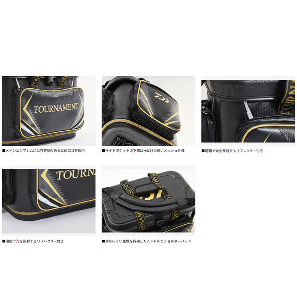 ダイワ磯クールバッグの最高峰! トーナメンター達が競技シーンで必要とする機能が更に進化!雨・水しぶきに強いハードかぶせブタ仕様。さらに小物類を乗せても転げ落ちにくい凸付き形状。本体メイン開口部には、サビに強い「ステンレスファスナースライダー」を採用。耐衝撃性については、発泡EVA/PU仕様の外装とハードインナーで、内容物を衝撃からプロテクト。また、衝撃に強いハードボトム+滑り止めパッドも装備。収納面については、外側にポケットを3個装備している。一つは糸くずなどをすぐ入れられるスリット付き仕様。さらに、小物類等を分別して収納できるインナートレイ付き上下2室構造となっている。その他にも、磯渡し時等にも安心な4点支持ハンドル付き、肩にやさしい大型パッド付きショルダーベルト、ショルダーベルトの汚れを抑えるホールドシステム、水が浸透せず、お手入れの楽なPU・ABS表面素材、暗い時間でも光が当たると反射するリフレクター付き。