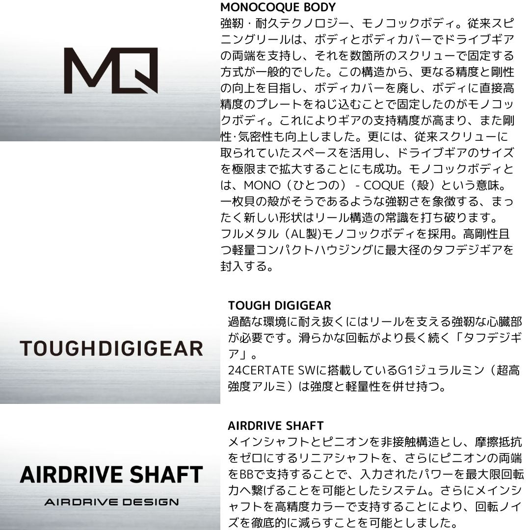 次世代スピニングリールの設計思想であるエアドライブデザインをはじめ、アルミ製フルメタルモノコックボディ、マグシールドなど、CERTATEの基本性能を支えるDAIWA独自の最先端テクノロジーを踏襲。その血脈を受け継ぎ、ソルトウォーター専用モデルとして必要不可欠な性能を突き詰めている。
