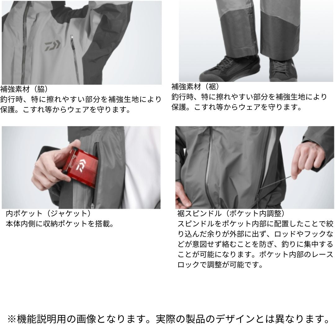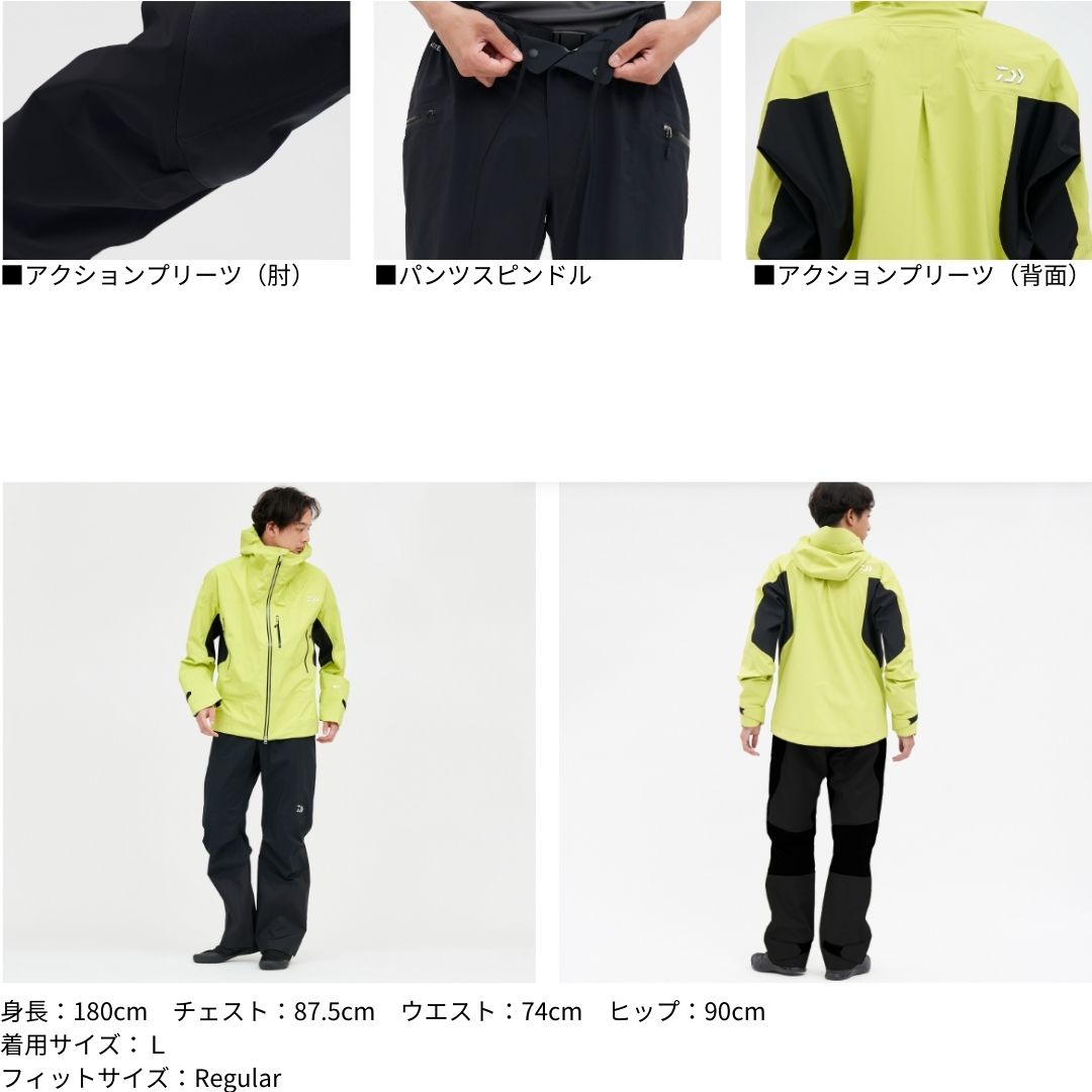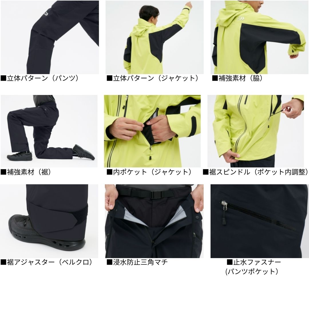 激しく動くオフショアゲームのために、軽量で透湿性の高いGORE-TEX Active productsの3層生地をベースにしたレインウェア。今まで培ってきたダイワのレインウェアの技術を元に、オフショアテスターとのフィールドテストを繰り返し、開発したオフショア用レインウェアのトップモデル。ロッドエンドとの摩擦が起きやすい脇下と、座ることが多いヒップ部、パンツ裾にはGORE-TEX Products生地の厚手タイプで切り替えている。上半身の動きを最大限に考慮したフルキャスト立体パターンに加え、肘や背中にタックを入れることにより、キャスティング時にもジギング時にもどこにも突っ張りを感じることなく釣りが可能。胸ポケットと高めに設定した脇ポケットは腰巻式のライフジャケットと干渉しないように設定。左脇ポケットには小物の収納に便利なメッシュポケット付き。パンツのポケットは船べりや座ったときに荷物が当たらないよう、サイドに搭載。ウエスト部分はシャーリングと伸縮性のあるスピンドル紐で動きやすさとフィット感を両立。