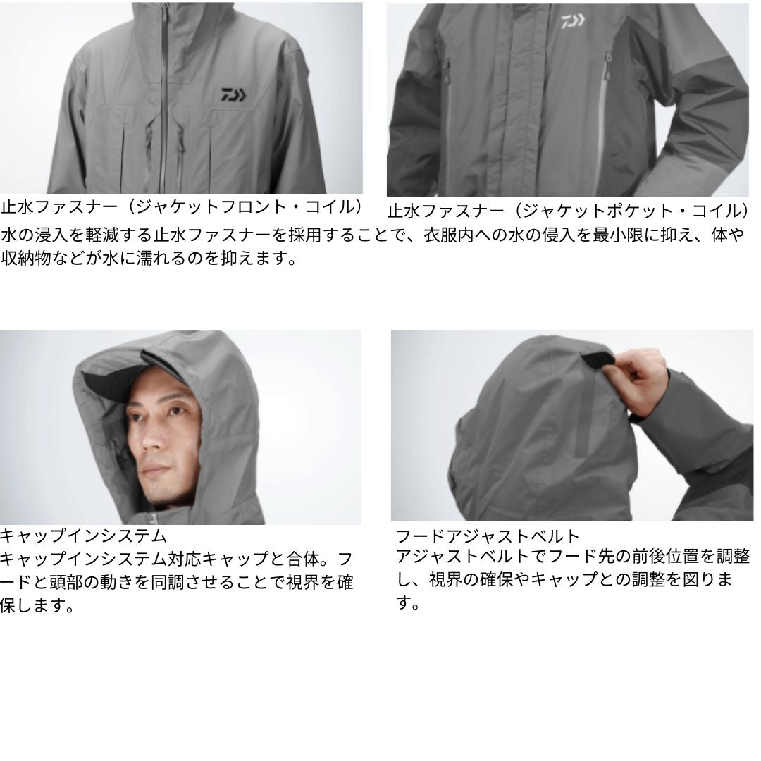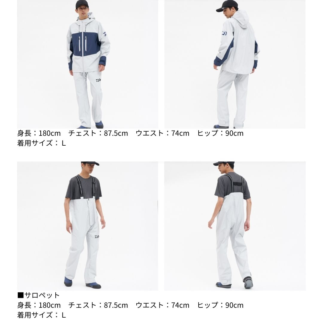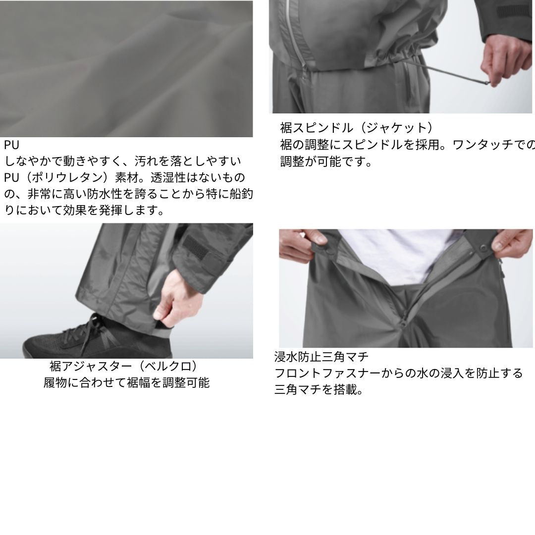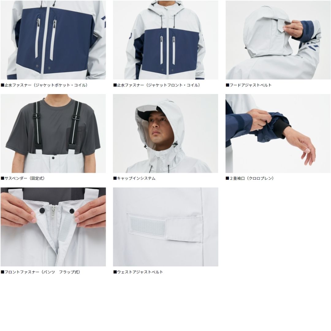 汚れが付き難く、耐久性に優れたPVC(ポリ塩化ビニル防水素材)を全面に採用。 フードにはキャップインシステムを搭載。対応キャップと合体し、フードと頭部の動きを同調させることで視界を確保。 ポケット部には水の浸入を軽減する止水ファスナーを採用し、収納物の濡れを最小限に抑える。 袖口は水の浸入を軽減する2重袖口仕様。 パンツは防水性の高いチェストハイサロペット仕様(サスペンダー付き)。 パンツのウエスト両脇にサイズ調整用ベルトを装備し、ウエストのフィット感を素早く調整可能。 パンツのフロントファスナーには水の浸入を防止する三角マチを搭載。
