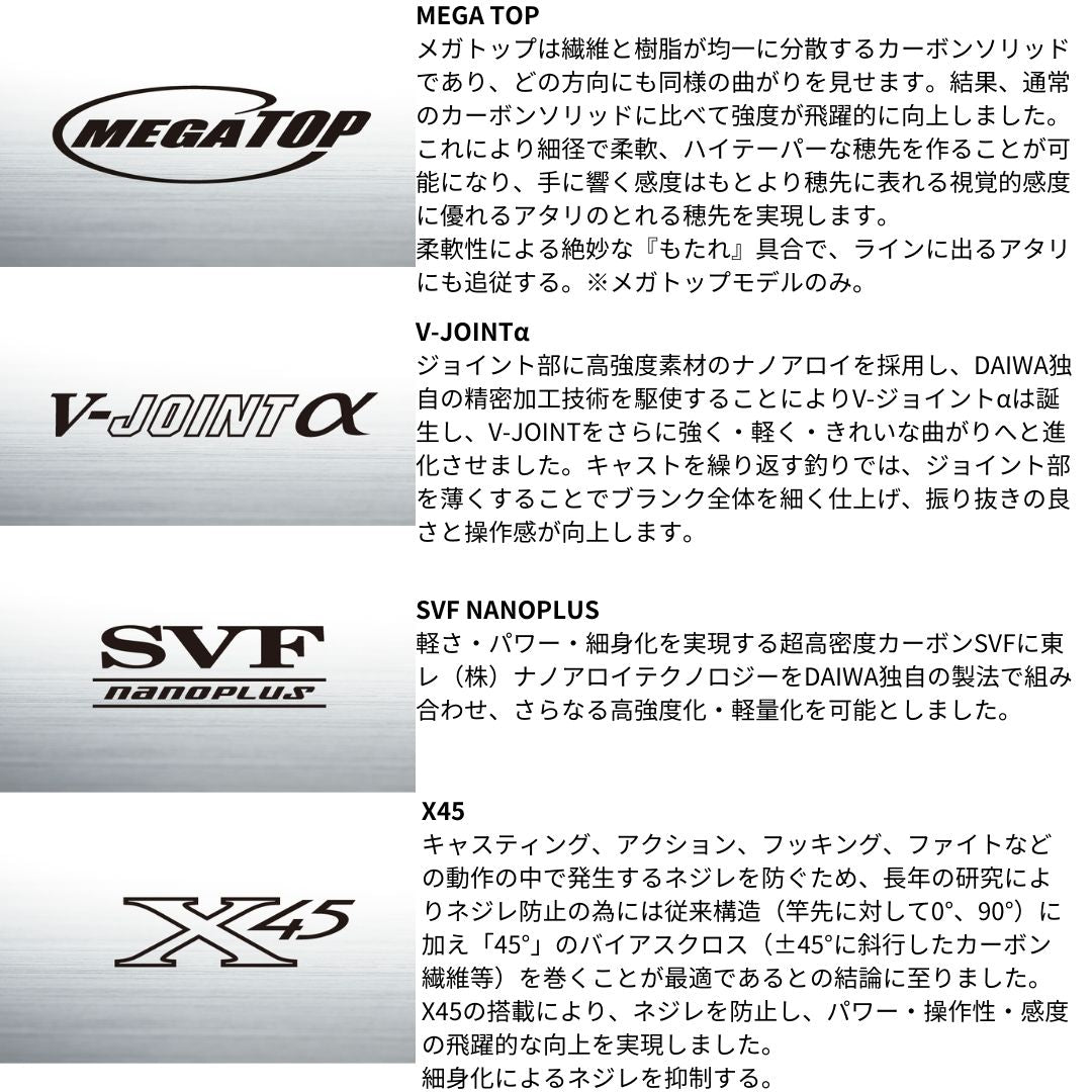 アイテム | 全長(m) | 継数 | 仕舞寸法(cm) | 標準自重(g) | 先径/元径(mm) | 錘負荷(号) | 適合ハリス ナイロン(号) | カーボン含有率(%) | JAN |