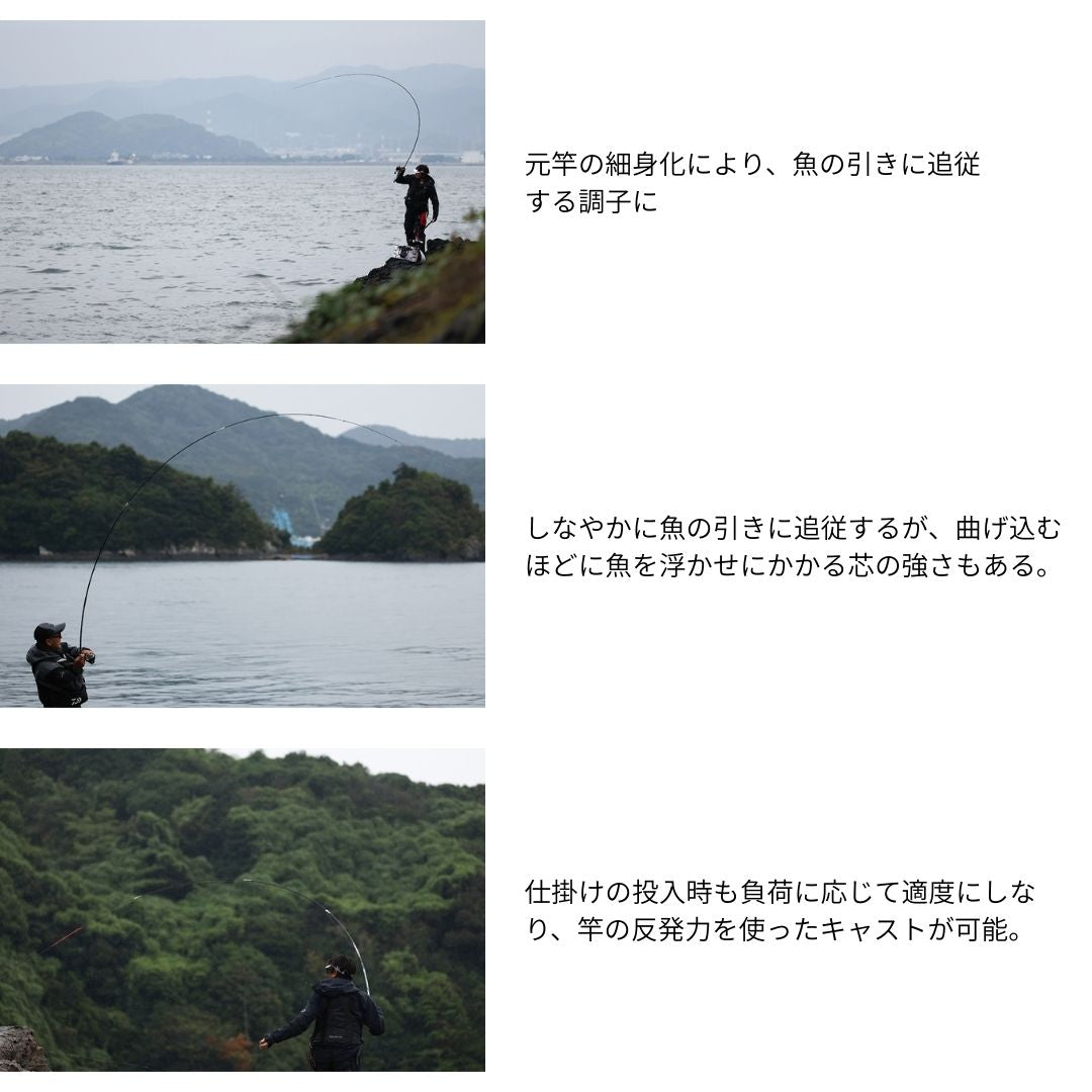 基本的な設計思想は胴調子ながら、高弾性素材の特性を引き出し、レスポンス高めたことで、遊びがない隙のないアイテムとなっている。魚の引きに応じて竿全体が適切に曲がり、しっかり対応してくれるイメージ。大型のチヌやマダイが出るようなエリア、あるいは深場などオールラウンドに対応できる一本。