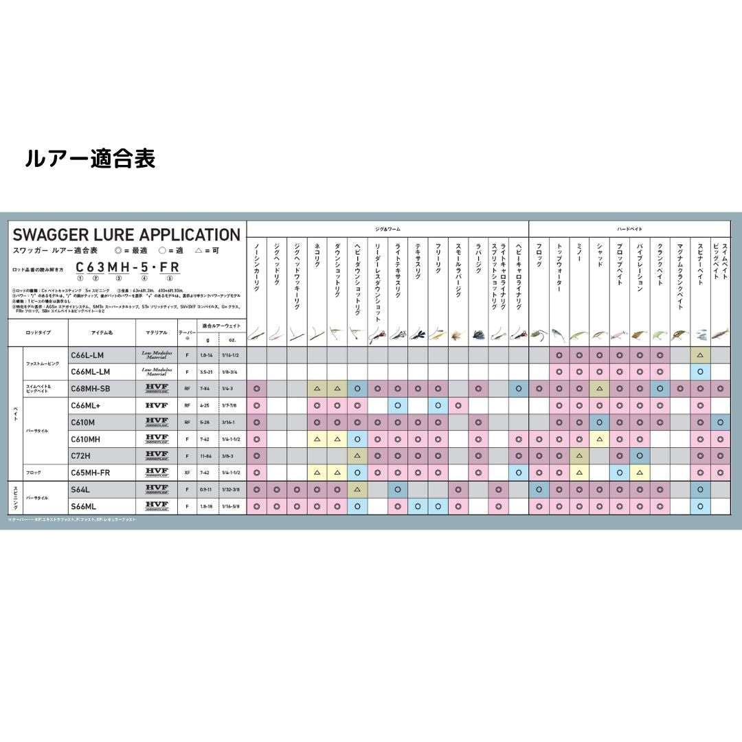 XHパワーのスティッフなティップに「”へ”の字テーパー」を施すことにより、バンクやシャローのカバー際、オーバーハングの下に重量級ルアーを正確に、小さな着水音で撃ち込むことが容易になり、トゥイッチやリーリングジャーク、シェイク巻きでルアーを繊細かつ正確に操り、グリフワの高速リトリーブではルアーを引っ張り過ぎることなく艶めかしいアクションを演出させ、止めた時にラインスラックを作りやすくなっている。