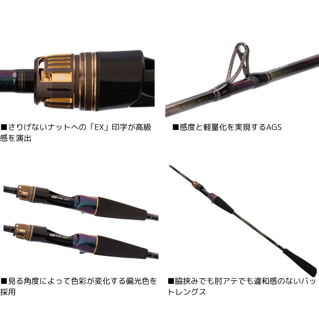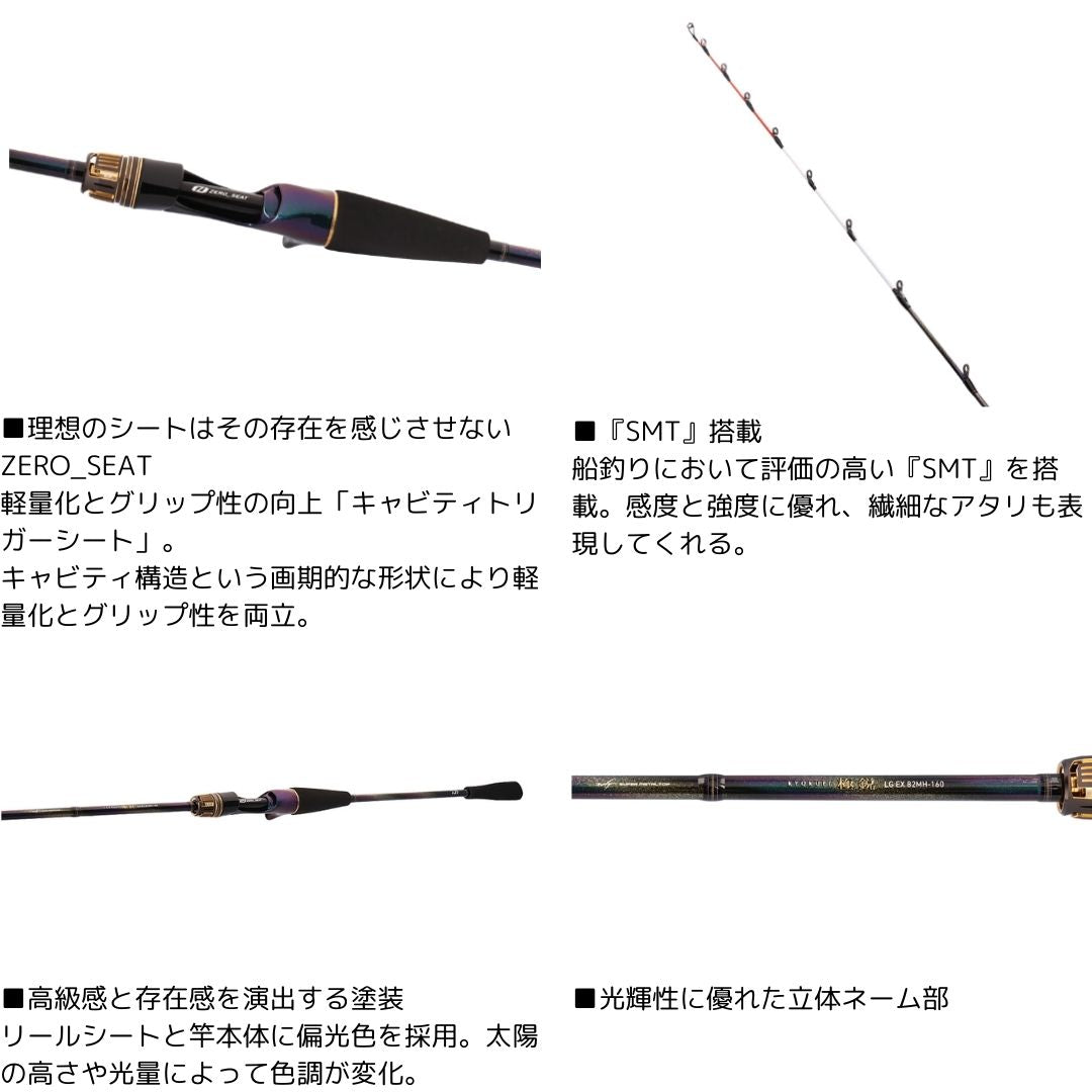 ライトゲームロッドの魅力の原点である軽さ、感度、操作性を、最新のダイワロッドテクノロジーを惜しげもなく搭載し徹底的にフィールドで研鑽した逸品こそ「極鋭LG EX」。リールシートには軽量・高感度のゼロシート、ブランクにはSVFナノプラスを採用することで実現した圧倒的とも言える軽さは、これまでにないシャープな操作感とレスポンスを獲得。極鋭の代名詞とも言える『SMT』は、しなやかさによる目感度と、食い込みの良さは勿論のこと、刺激的とも言えるほどの手感度も両立。ガイドには軽量、高剛性を誇る『AGS』のRフレームにCリング、Nリングを搭載し、感度と軽さに磨きをかける。もっとライトに、もっとアクティブに楽しめる、ライトゲームロッドの頂点。