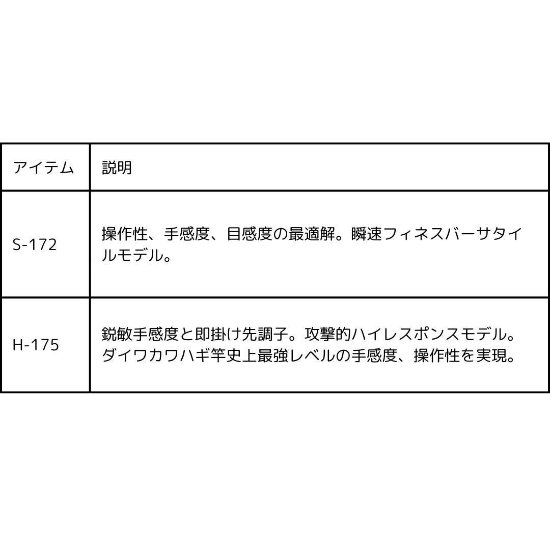 #S-172全長(m):1.72 継数:1 仕舞寸法(cm):172  標準自重(g):49 先径/元径(mm):0.9/9.8 錘負荷(号):10~35 カーボン含有率(%):99 JAN:4550133449239