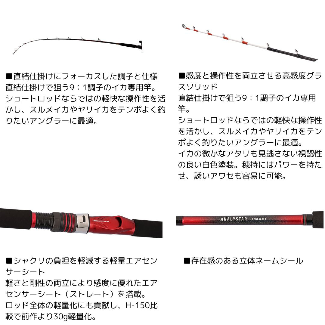 パラソル級ヤリイカやスルメイカの多点掛けにも負けないパワーとシャープなシャクリと手返しの操作性を高めた150のショートレングスなど、直結釣法に最適な仕様を備えた専用設計。