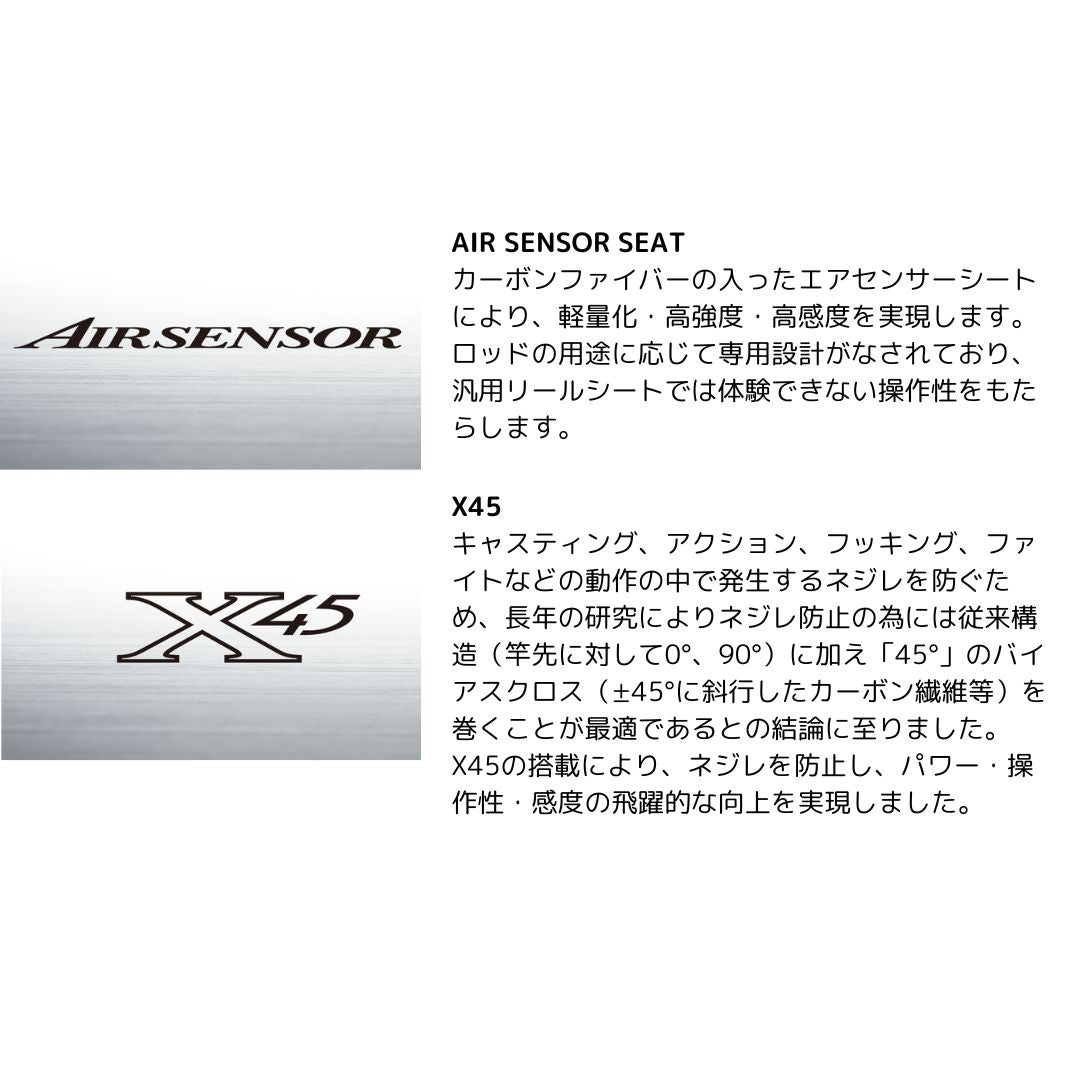 小型のヤリイカのアタリも目感度・手感度でわかりやすく表現する高感度グラスソリッド穂先を採用。リールシートに軽量・高強度・高感度のカーボンファイバー入りエアセンサーシートを採用し、更なる軽量化と理想のパーミングを実現。80号~180号までのオモリに対応し、浅場から深場まで、そして急流でも幅広く活躍する調子を追求。