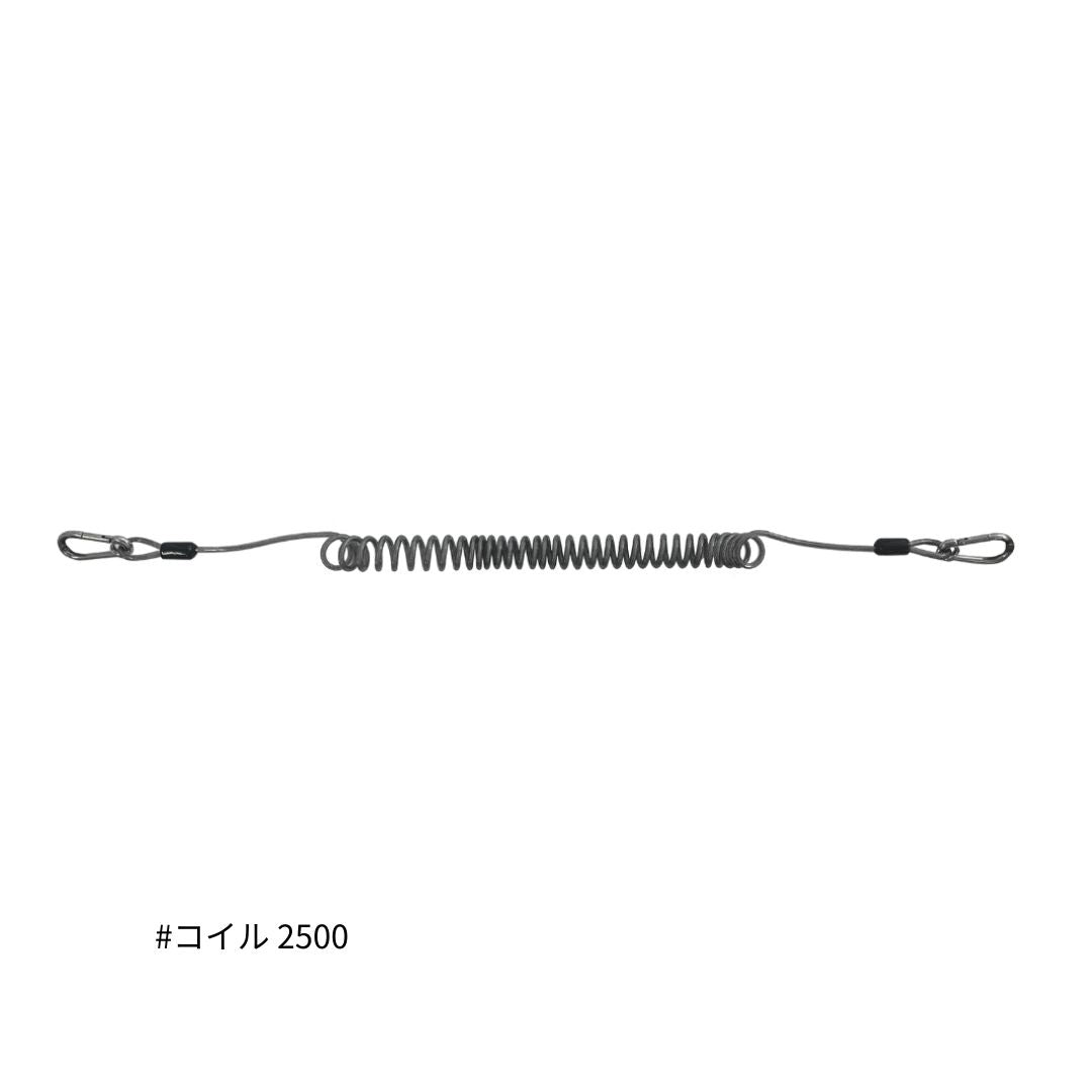 【コイル2500】最大使用全長(㎜):2500 最大強度(kg):100 材質:ウレタン+ステンレスワイヤー ロープ形状:コイルロープ 接続部(固定側):SUSリング付きカラビナ 接続部(タックル側):SUSカラビナ